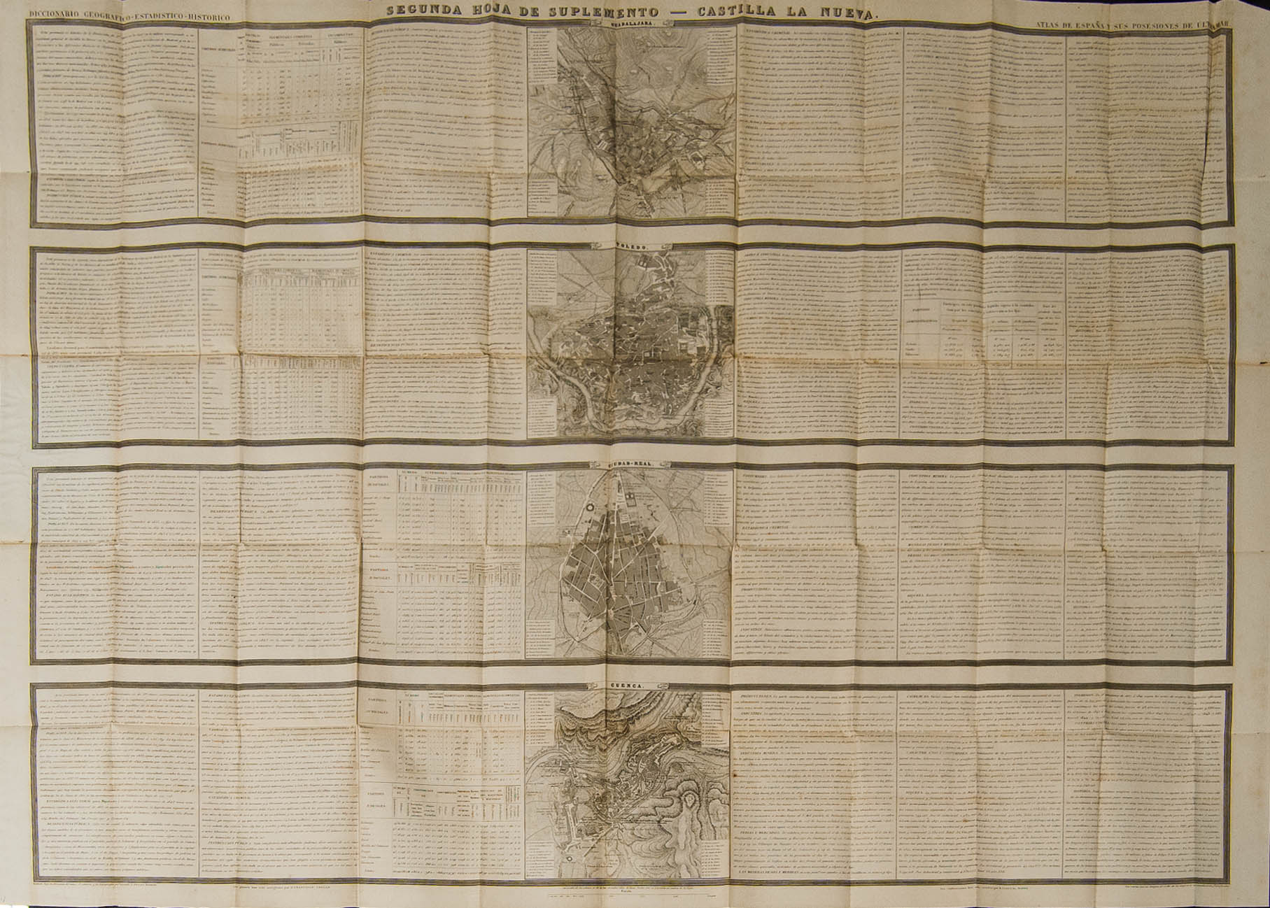 (1860ca). ATLAS OF SPAIN AND ITS OVERSEAS POSSESSIONS, Francisco Coello. Corresponding to the 2nd Sheet of the CASTILLA LA NUEVA Supplement and in the hardcover edition of 1860ca (map and folder), historical and administrative data, etc., and the plans of the largest cities in the province at that time are included. MAGNIFICENT AND UNUSUAL MAP OF THE PERIOD OF ISABEL II, WHICH INCLUDES ALL THE POST ROUTES OF THE PERIOD, IDEAL FOR THE STUDY OF THE POSTAL HISTORY OF THE COLLECTOR OF THIS REGION, THIS WORK HAS ALWAYS BEEN PRESENT IN THE GREAT SPANISH PHILATELIC LIBRARIES SUCH AS THOSE OF MONGE, CLIMBING, TIZON, GALVEZ. Ex-GRAUS.