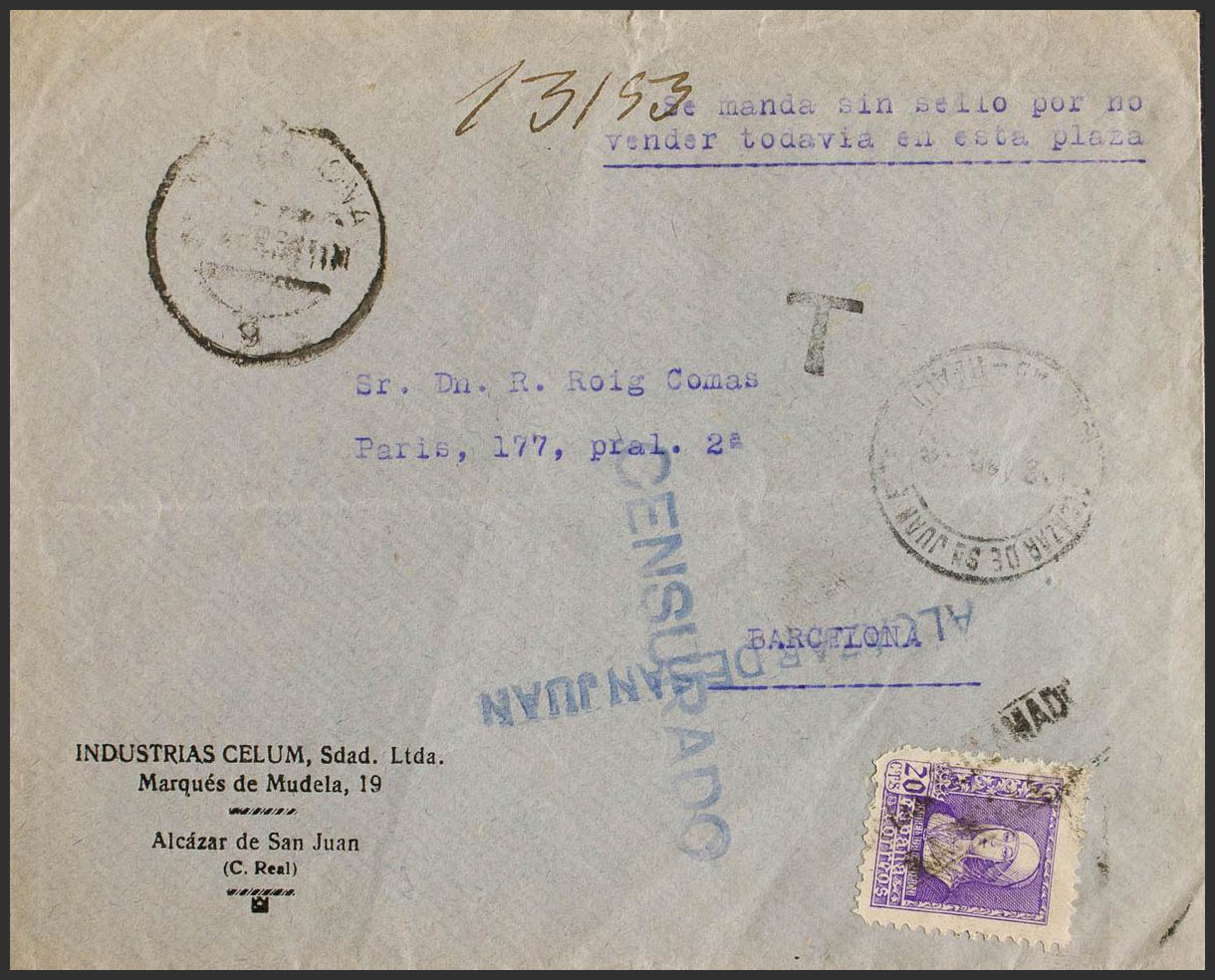 855. 1938. 20 cts violet. ALCAZAR OF SAN JUAN to BARCELONA. On the front typed text "It is sent without a stamp because it is not yet sold in this place", the letter is appraised upon arrival by applying the 20 cts stamp in Barcelona and claiming said postage. MAGNIFICENT AND RARE.