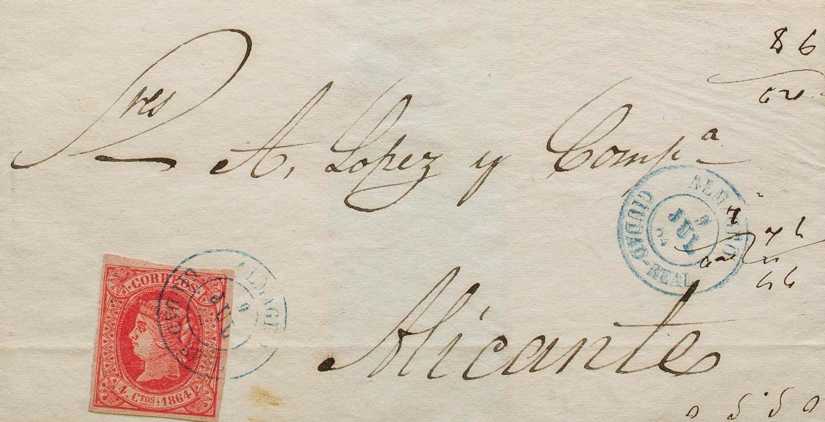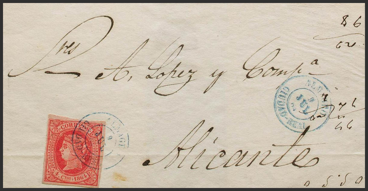 64. 1864. 4 red cuartos . ALMAGRO to ALICANTE. Postmark ALMAGRO / CIUDAD REAL, in blue. MAGNIFICENT AND RARE.