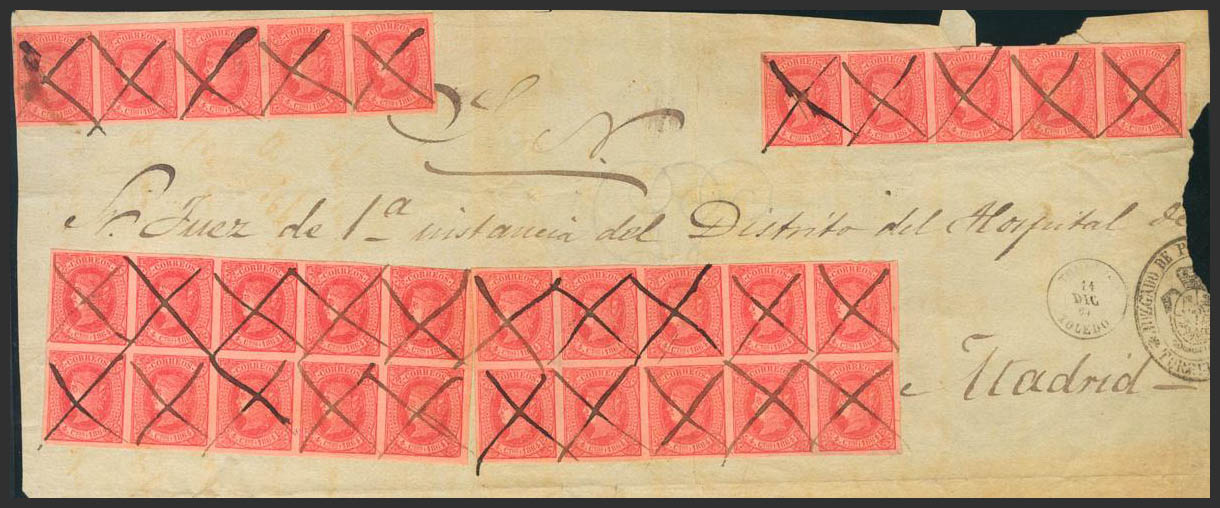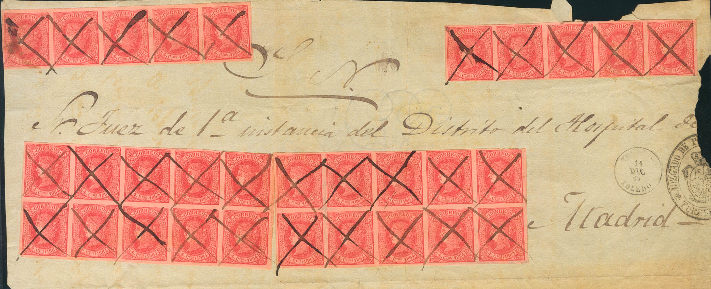 64(30). 1864. 4 red cuartos , thirty stamps (two blocks of ten and two strips of five). Judicial Escrow Front from TORRIJOS (TOLEDO) to MADRID. Disabled with cross pen strokes. BEAUTIFUL AND VERY RARE.
