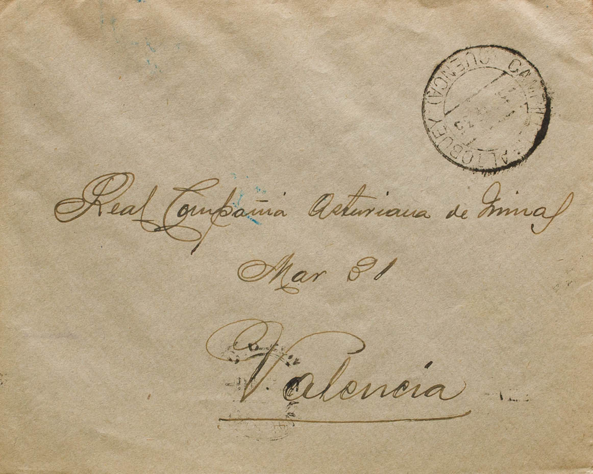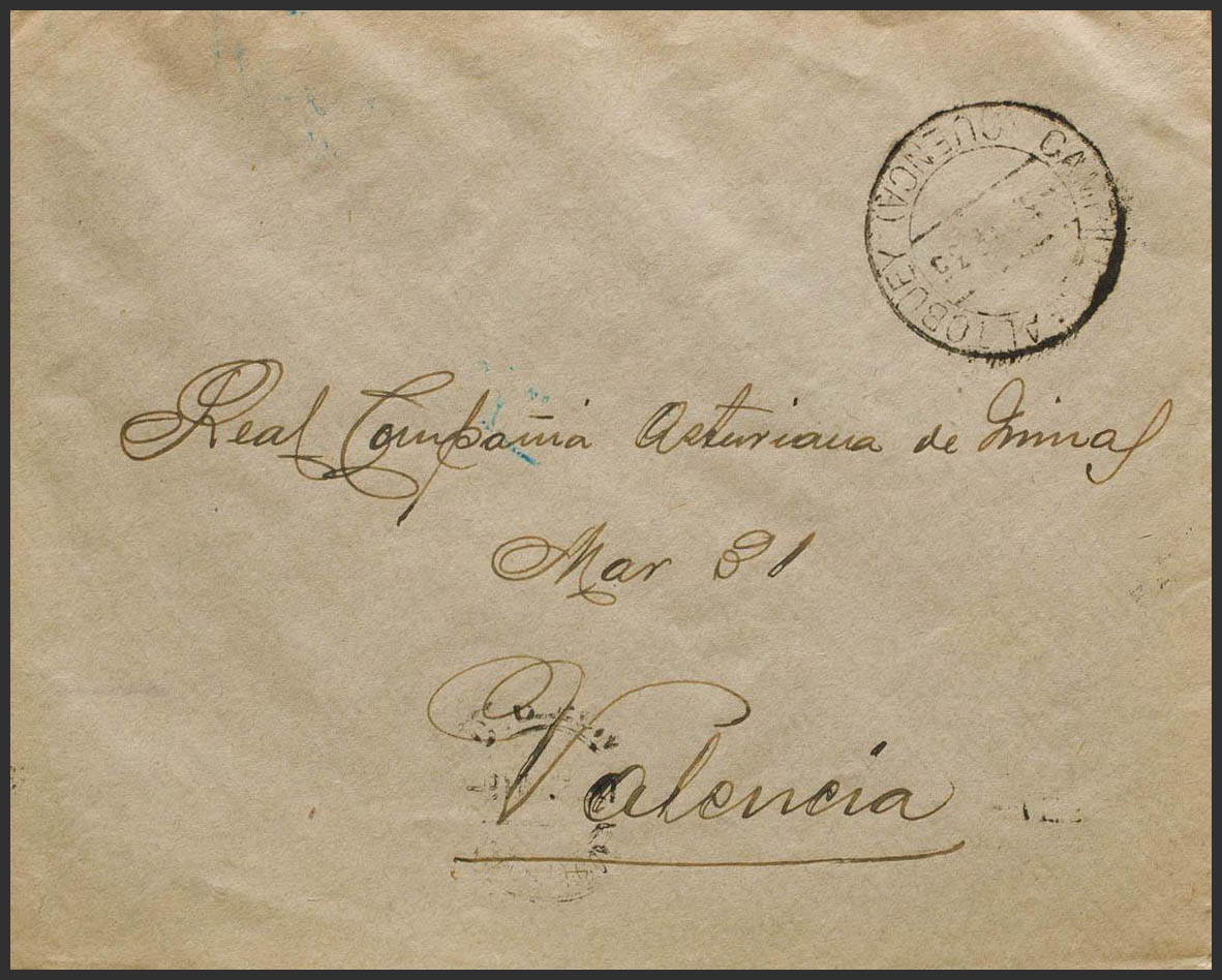 1935. CAMPILLO DE ALTOBUEY (CUENCA) in VALENCIA. On the back, mark of the City Council, in violet and handwritten "I certify that this letter is postage-free due to lack of stamps in the town, Campillo 4 de Enero de 1935, el Mayor" and arrival. MAGNIFICENT AND RARE.