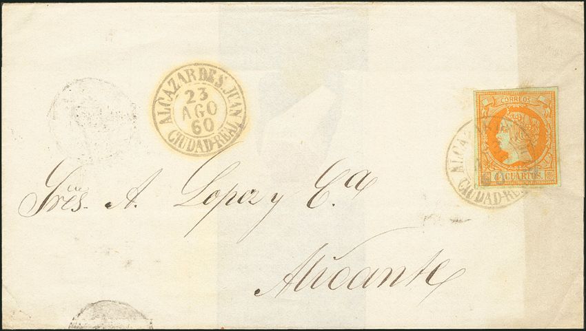 52. 1860. 4 cuartos yellow. ALCAZAR DE S. JUAN to ALICANTE. Postmark ALCAZAR DE S. JUAN / CIUDAD-REAL (Type I). MAGNIFICENT.