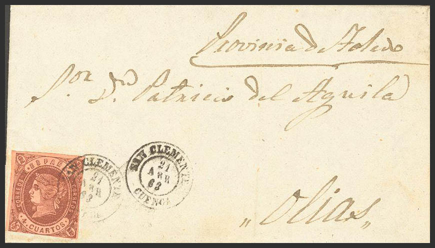 58. 1863. 4- cuartos chestnut. SAN CLEMENT to OLIAS. Postmark SAN CLEMENTE / CUENCA. BEAUTIFUL AND RARE.