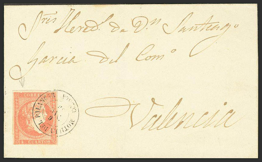 48. 1858. 4 red cuartos . MOTILLA DEL PALANCAR to VALENCIA. Postmark MOTILLA DEL PALANCAR / CUENCA. MAGNIFICENT.