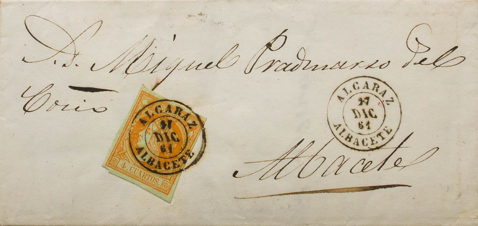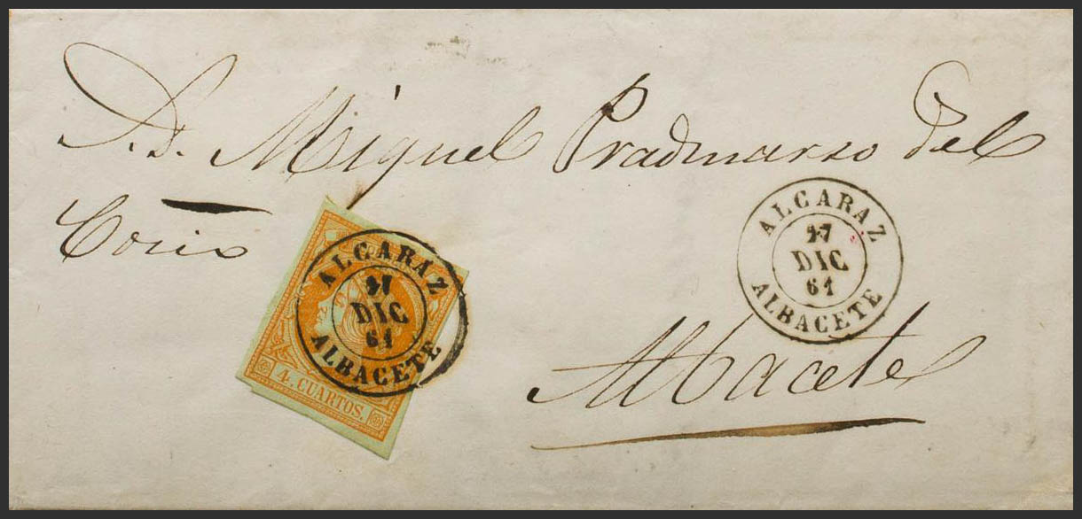 52. 1861. 4 orange cuartos . ALCARAZ to ALBACETE. Postmark ALCARAZ / ALBACETE. MAGNIFICENT.