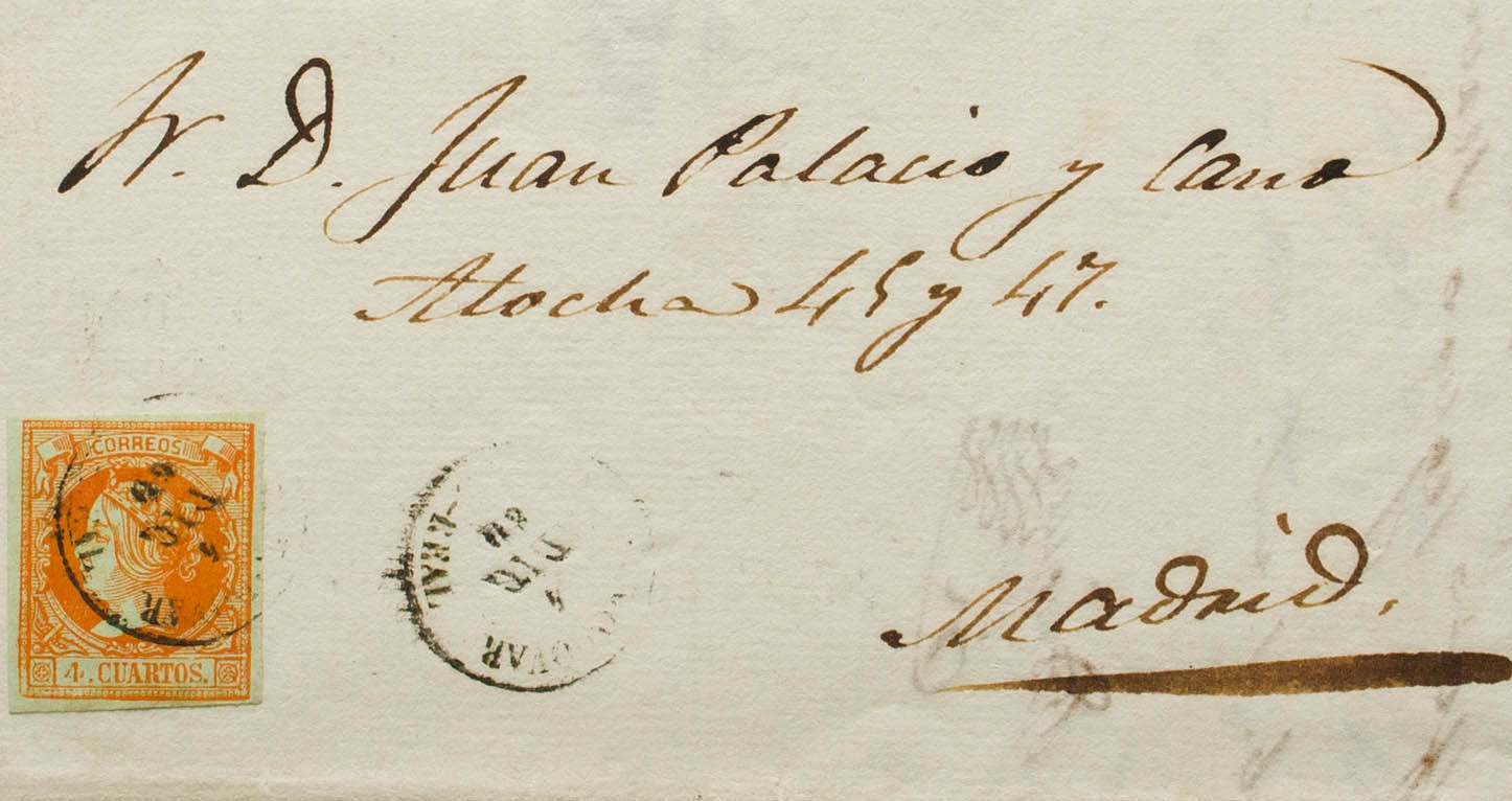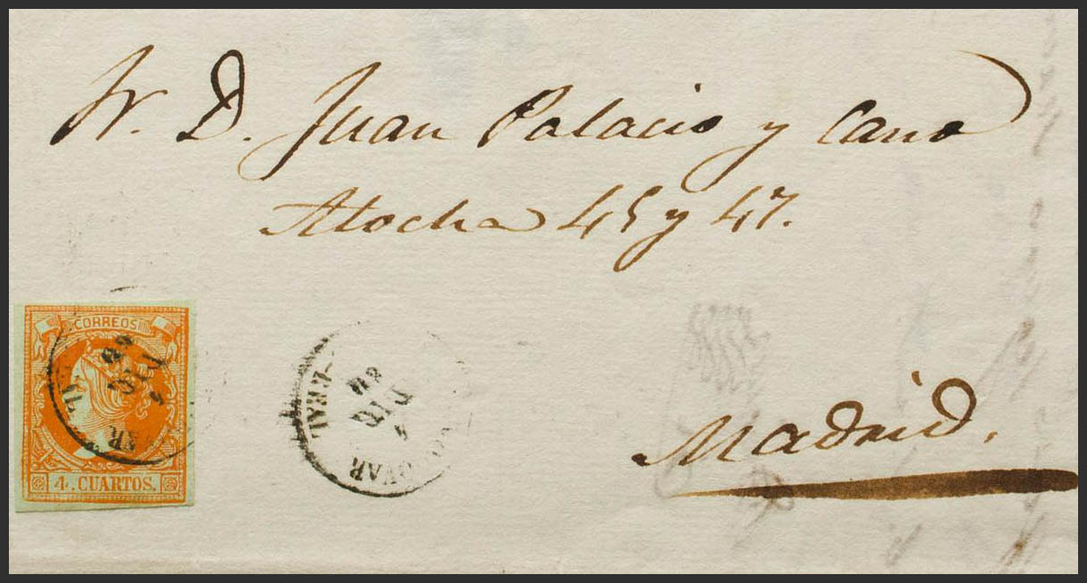 52. 1860. 4 orange cuartos . ALMODOVAR to MADRID. Postmark ALMODOVAR / CIUDAD REAL. PRETTY.