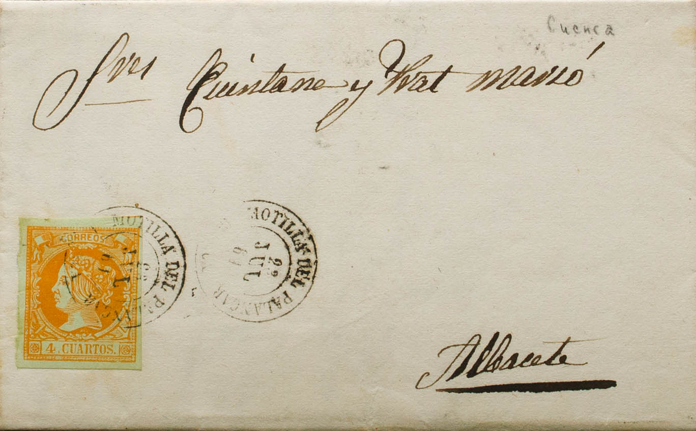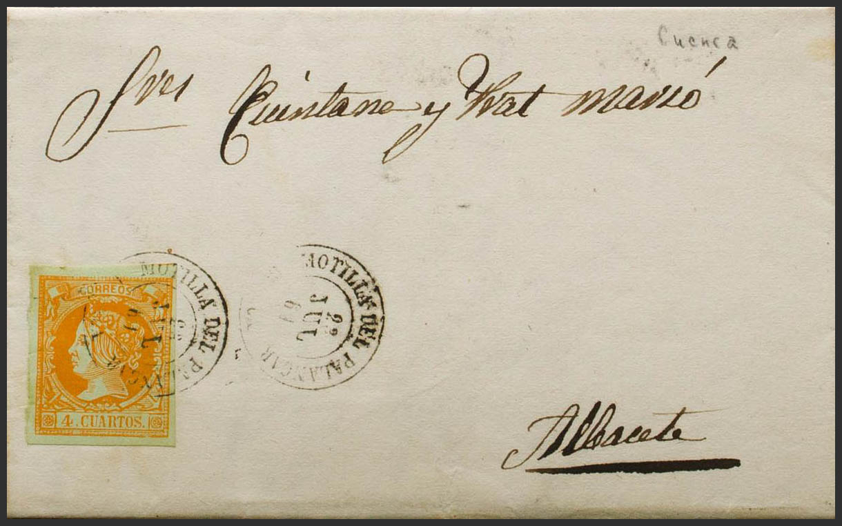 52. 1861. 4 orange cuartos . INIESTA to ALBACETE. Postmark MOTILLA DEL PALANCAR / CUENCA. MAGNIFICENT AND VERY RARE.