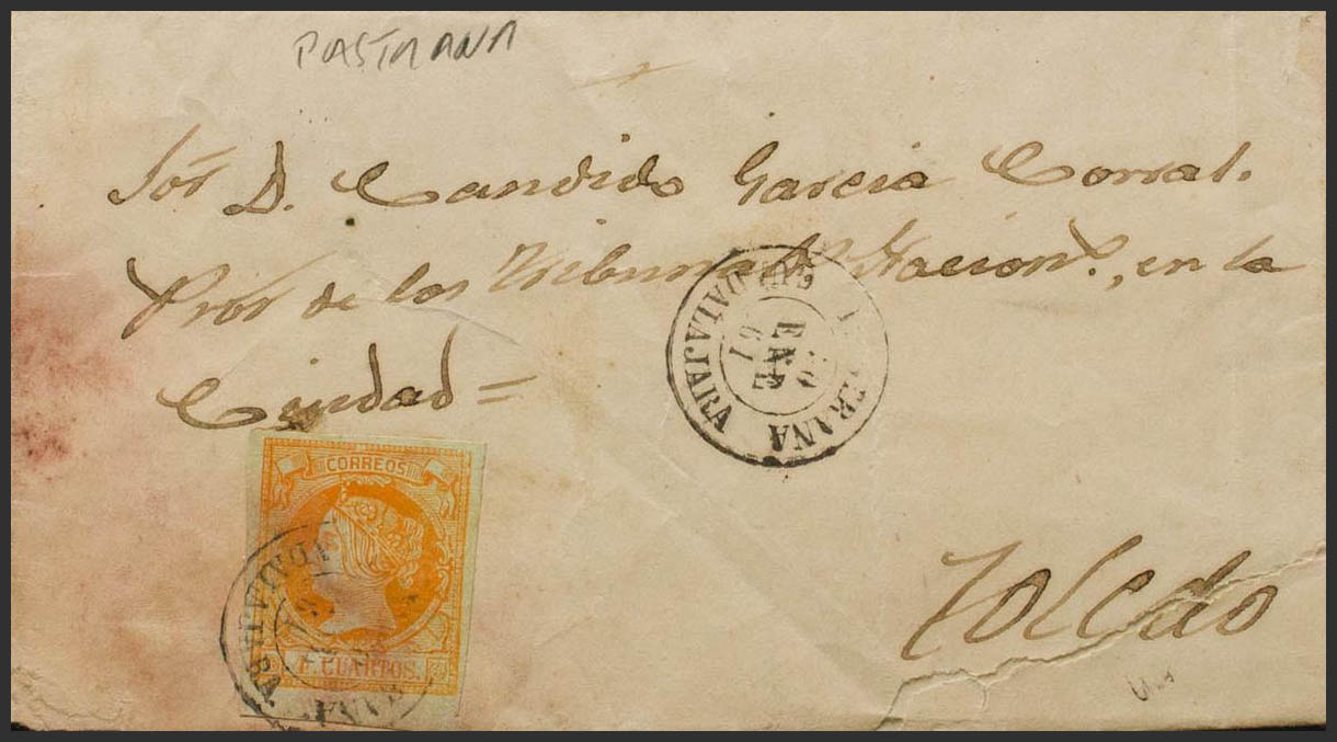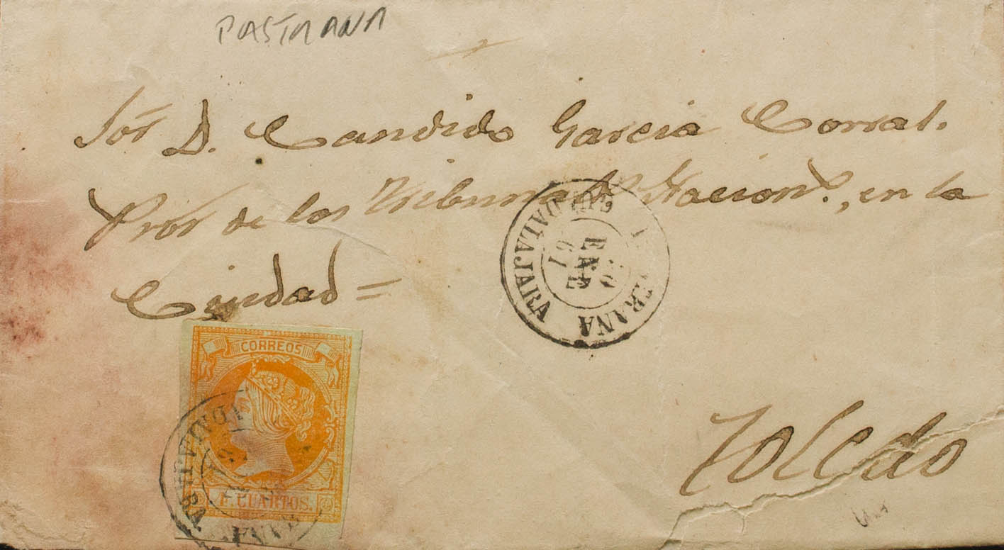 52. 1861. 4 orange cuartos . PASTRANA to TOLEDO (damp spots). Postmark PASTRANA / GUADALAJARA. BEAUTIFUL AND RARE.