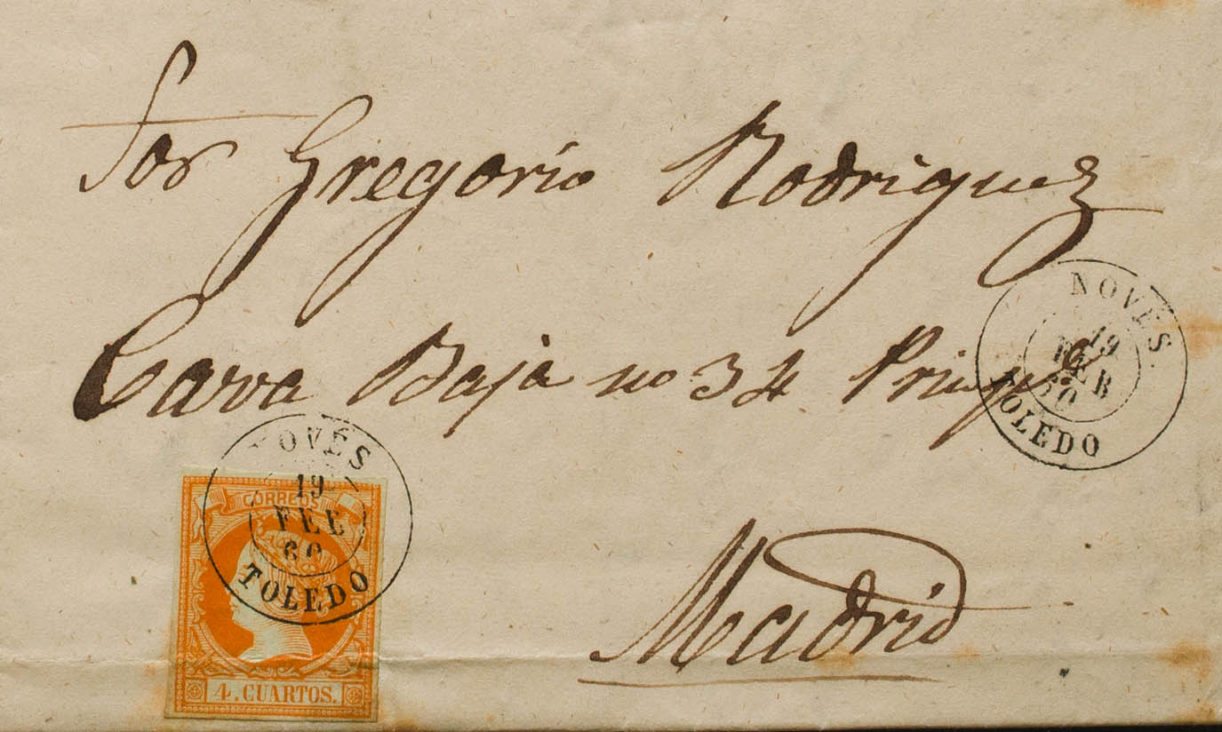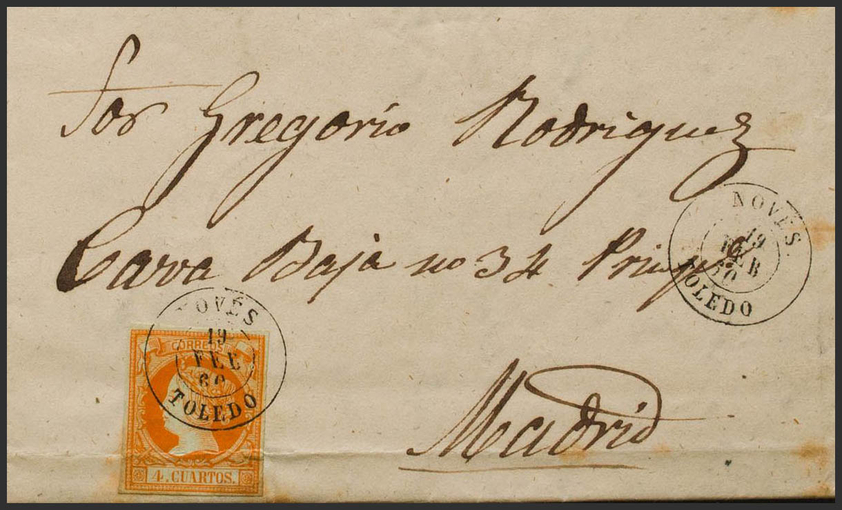 52. 1860. 4 orange cuartos . TORRIJOS to MADRID. Postmark NOVES / TOLEDO. MAGNIFICENT.