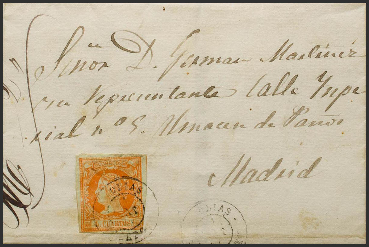 52. 1861. 4 orange cuartos . BARGAS (TOLEDO) to MADRID. Postmark OLIAS / TOLEDO. MAGNIFICENT.