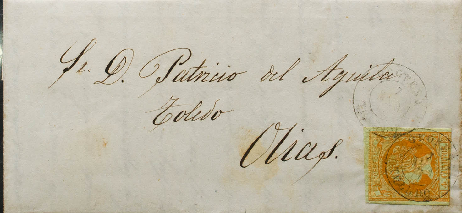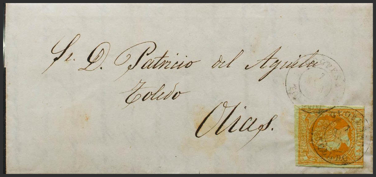 52. 1861. 4 orange cuartos . GRILLS (TOLEDO) to OLIAS. Postmark OROPESA / TOLEDO. MAGNIFICENT AND RARE.