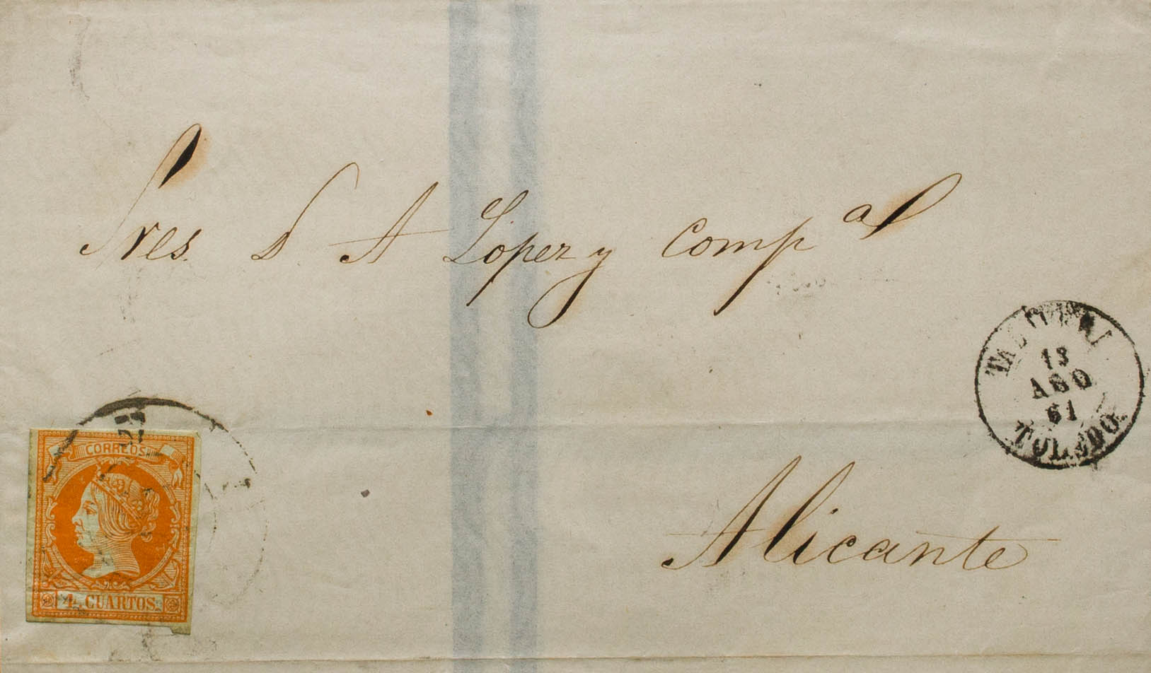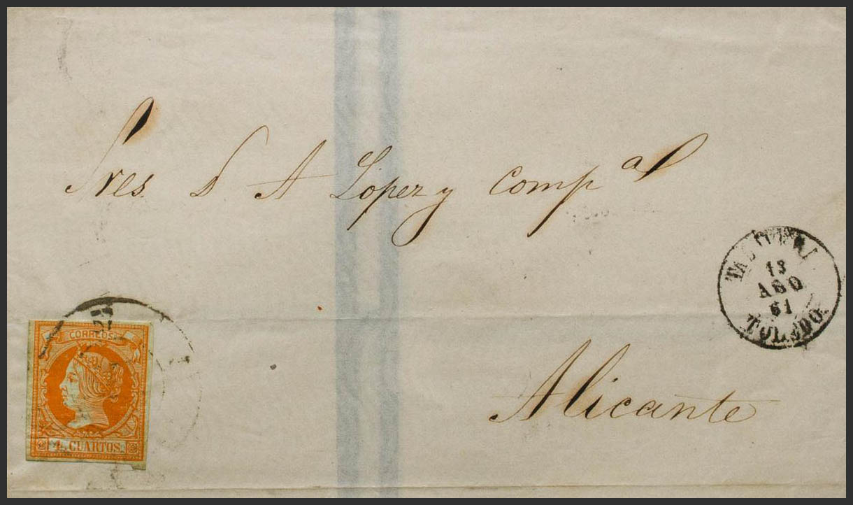 52. 1861. 4 orange cuartos . TALAVERA to ALICANTE. Postmark R.CARRETA Nº57, from Talavera de la Reina. MAGNIFICENT AND RARE.