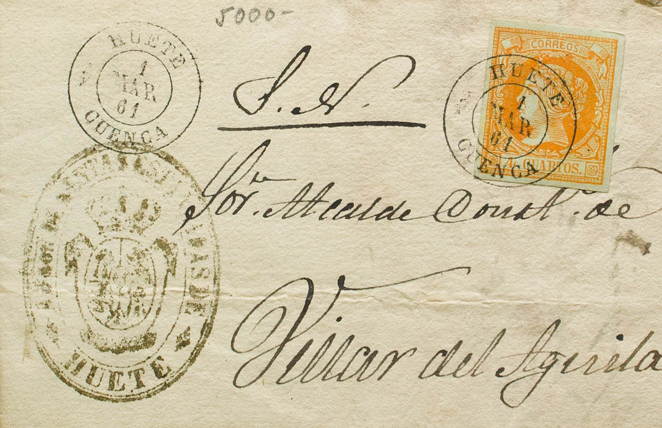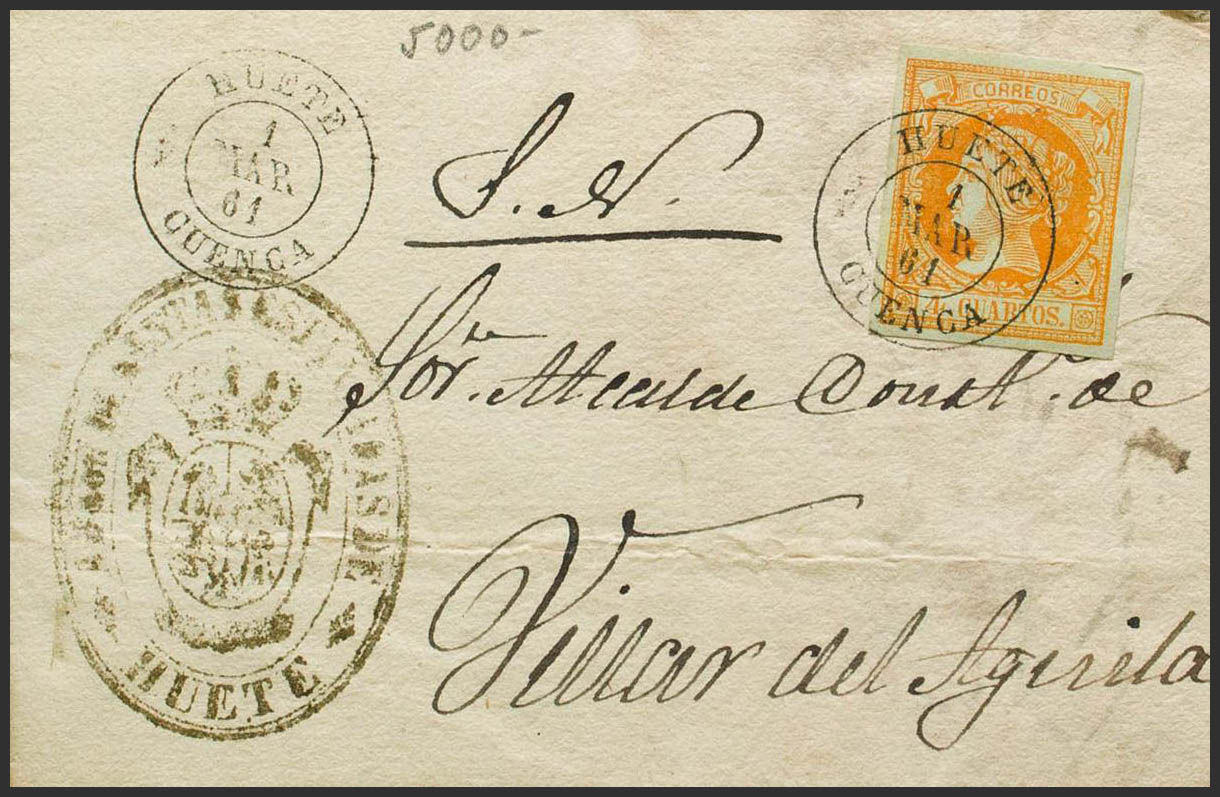52. 1861. 4 orange cuartos . HUETE (CUENCA) to VILLAR DEL AGUILA. Postmark HUETE / CUENCA. MAGNIFICENT.