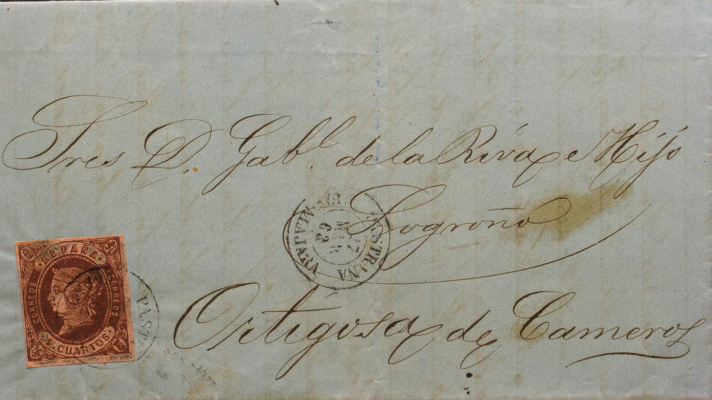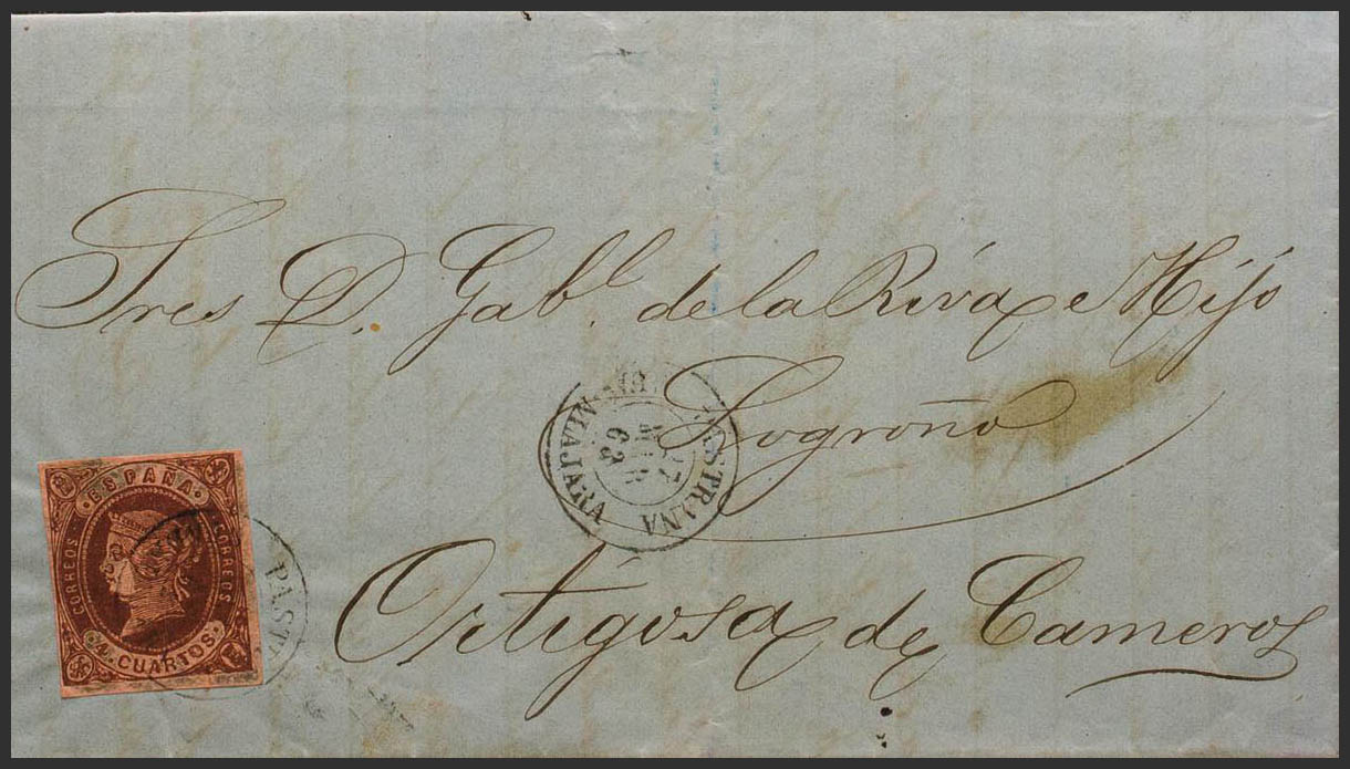 58. 1863. 4- cuartos chestnut. SAYATON (GUADALAJARA) to ORTIGOSA. Postmark PASTRANA / GUADALAJARA. MAGNIFICENT AND RARE.