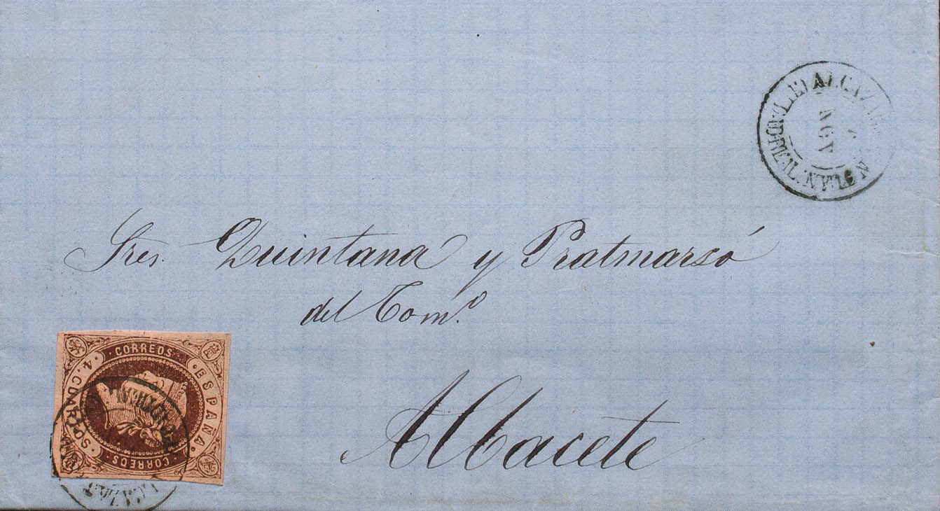 58. 1862. 4- cuartos chestnut. ALCAZAR OF SAN JUAN to ALBACETE. Postmark ALCAZAR DE SAN JUAN / CIUDAD REAL. MAGNIFICENT AND VERY RARE WITH TYPE II.