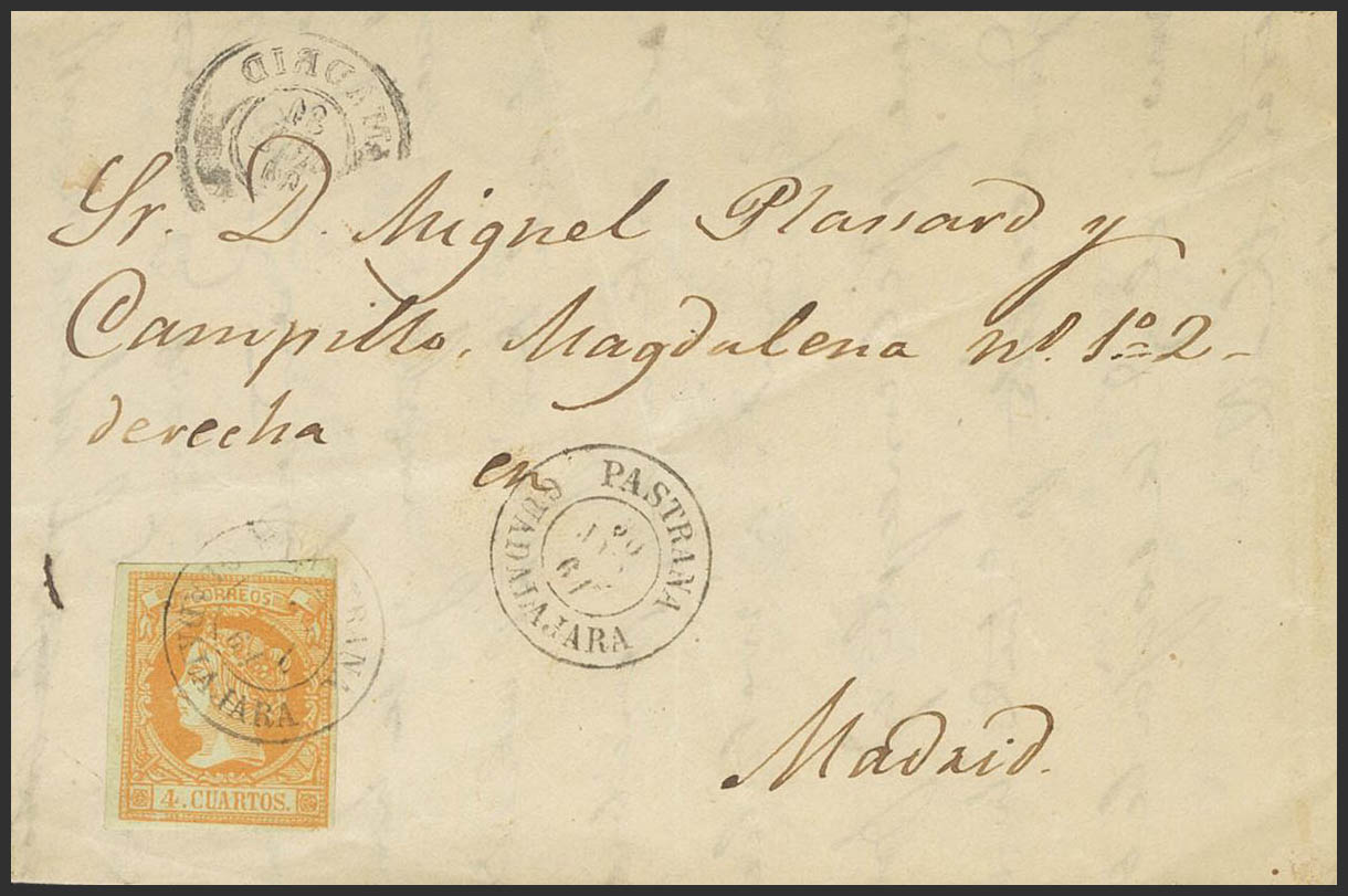 52. 1861. 4 orange cuartos . PASTRANA to MADRID. Postmark PASTRANA / GUADALAJARA. MAGNIFICENT AND RARE.