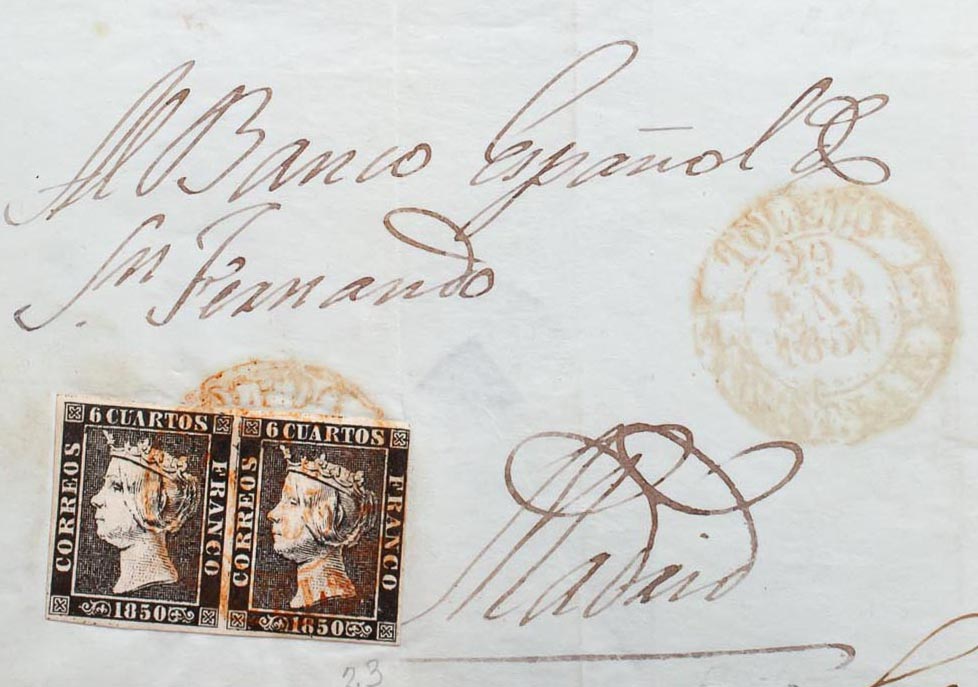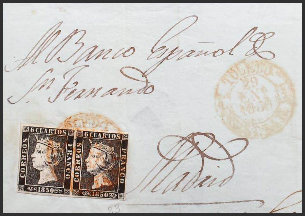 1(2). 1850. 6 cuartos black, pair. TOLEDO to MADRID. Baeza postmark TOLEDO / CAST. THE N. MAGNIFICENT AND VERY RARE.