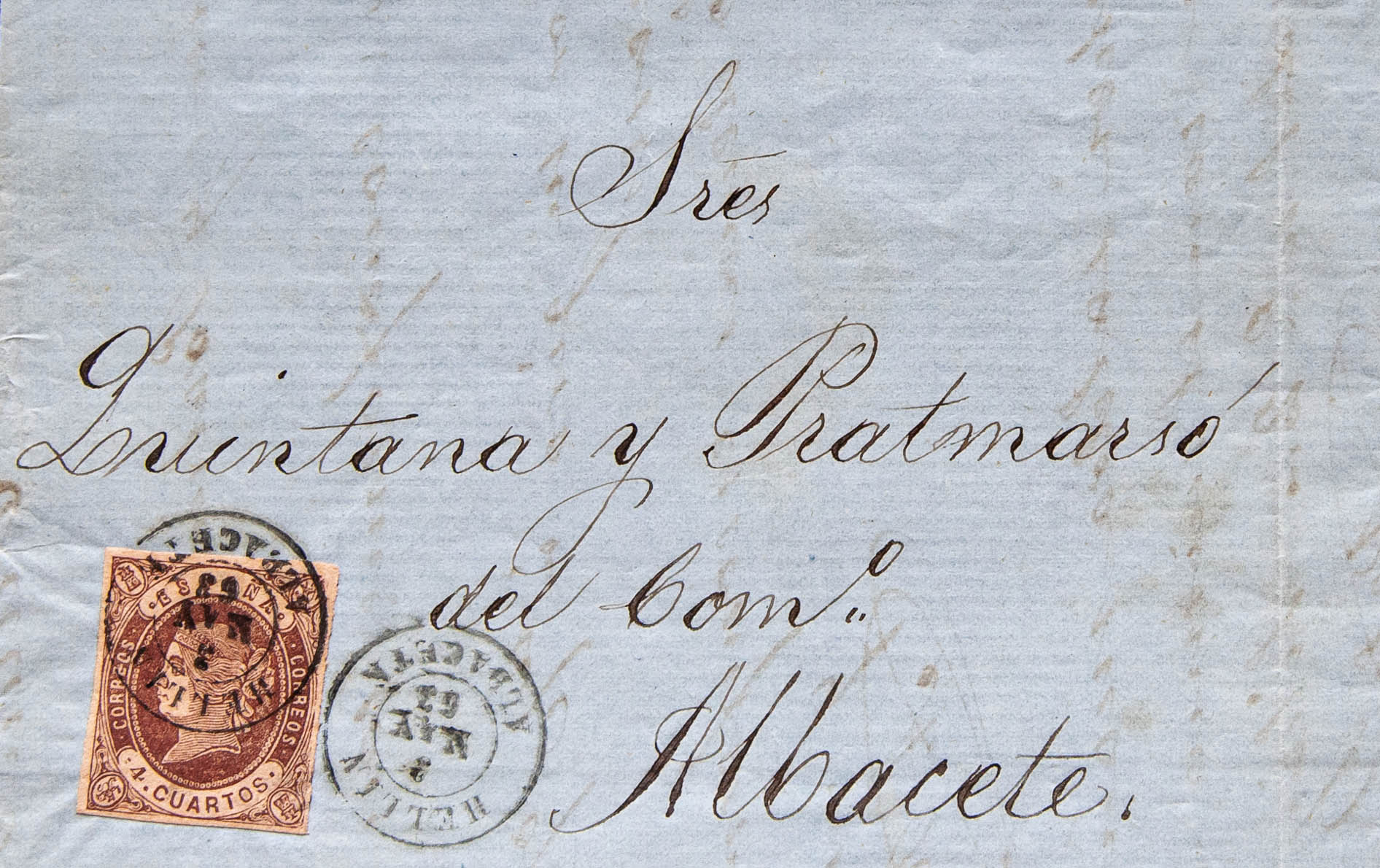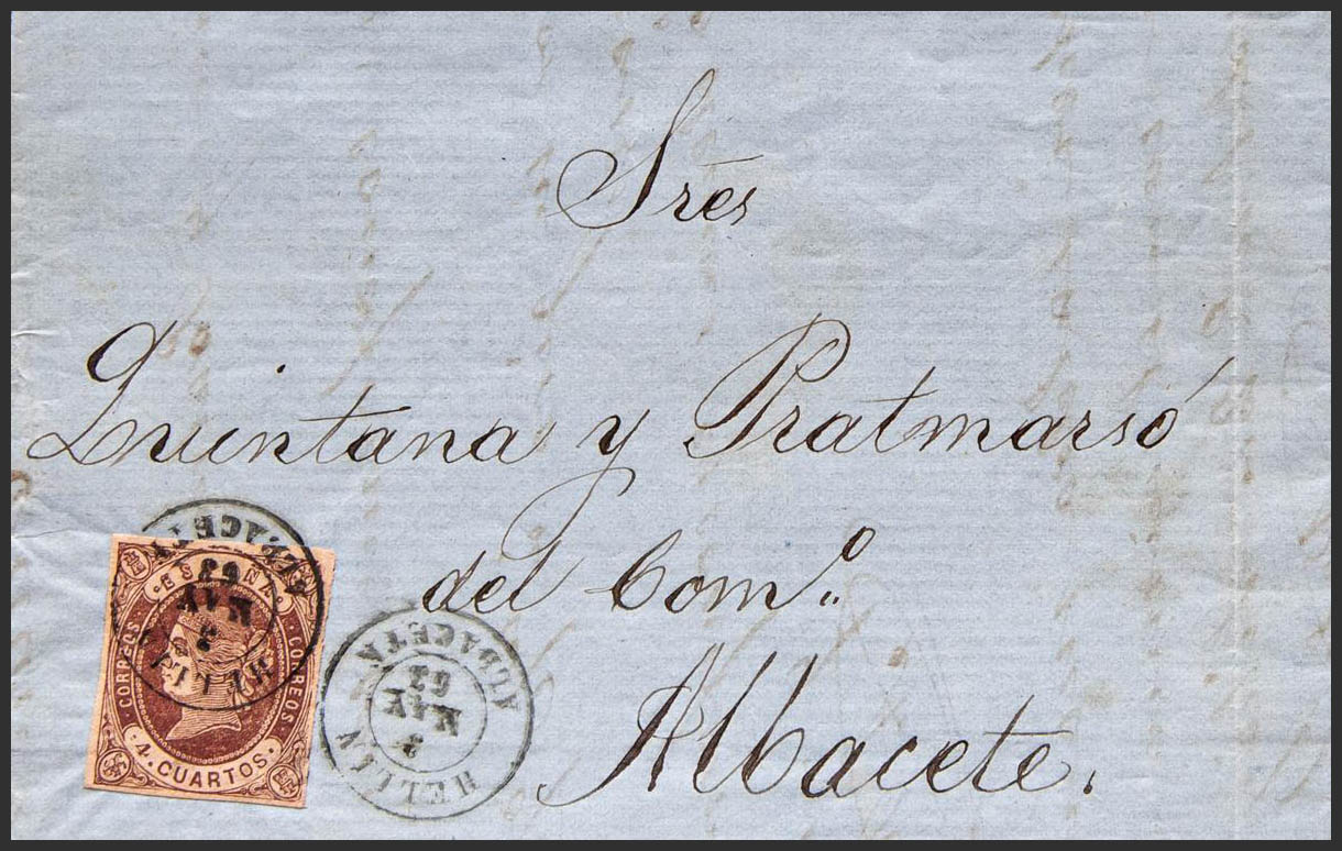 58. 1862. 4 cuartos chestnut. HELLIN to ALBACETE. Postmark HELLIN / ALBACETE. MAGNIFICENT.