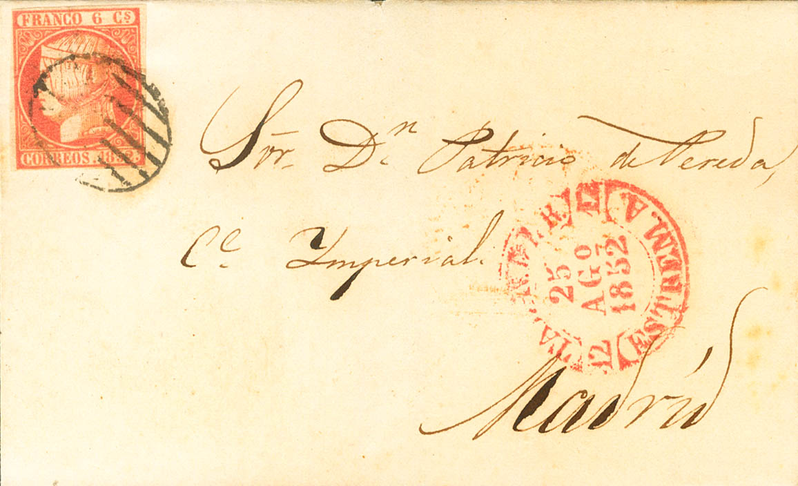 |ABOUT| 12. 1852. 6 pink quarters. TALAVERA DE LA REINA (TOLEDO) to MADRID. On the Baeza front TALAV.DLR / ESTREM.A. MAGNIFICENT.