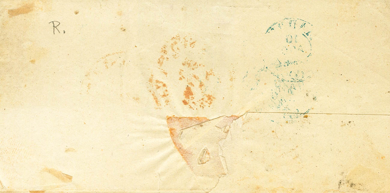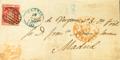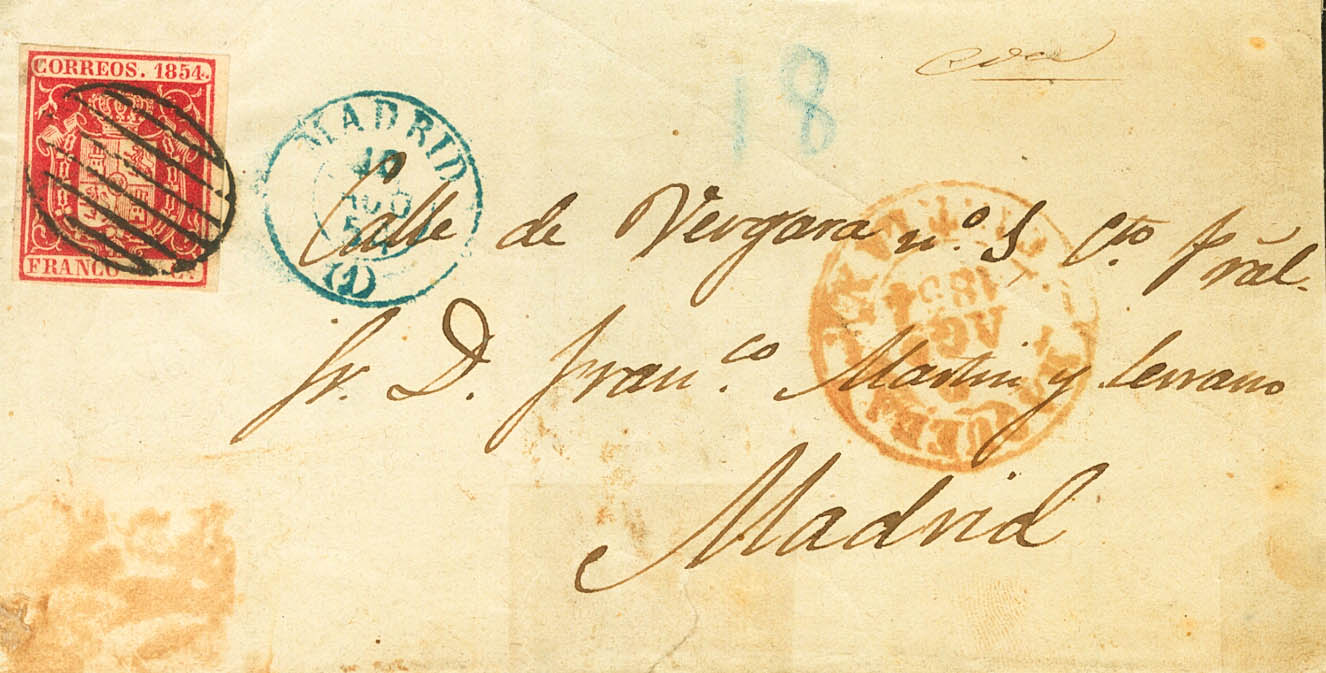 |ABOUT| 24. 1854. 6 carmine quarters. MAQUEDA (TOLEDO) to MADRID. On the front Baeza MAQUEDA / CAST.LA N, in red and date stamp MADRID / (1) (Type I), in blue applied at destination. MAGNIFICENT AND RARE.