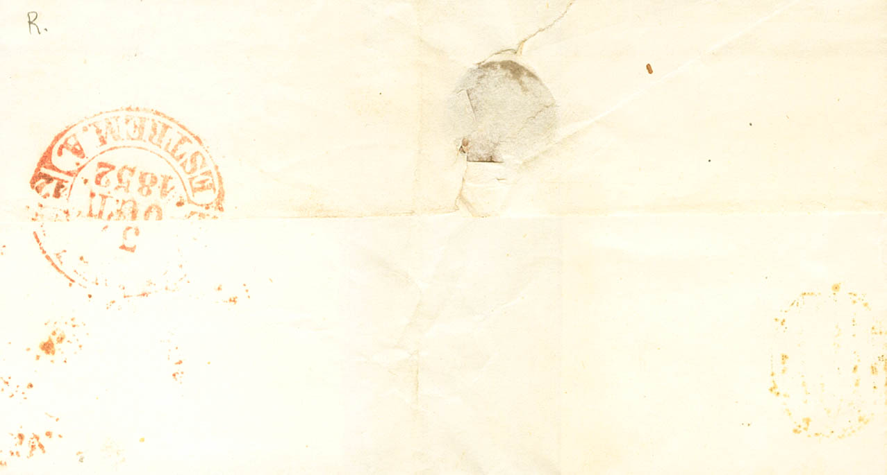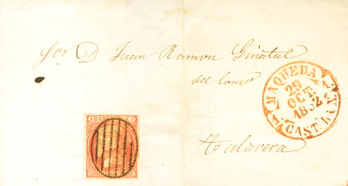|ABOUT| 12. 1852. 6 pink quarters. MAQUEDA (TOLEDO) to TALAVERA DE LA REINA. On the front Baeza MAQUEDA / CAST.LA N, in red. MAGNIFICENT PRINTING.