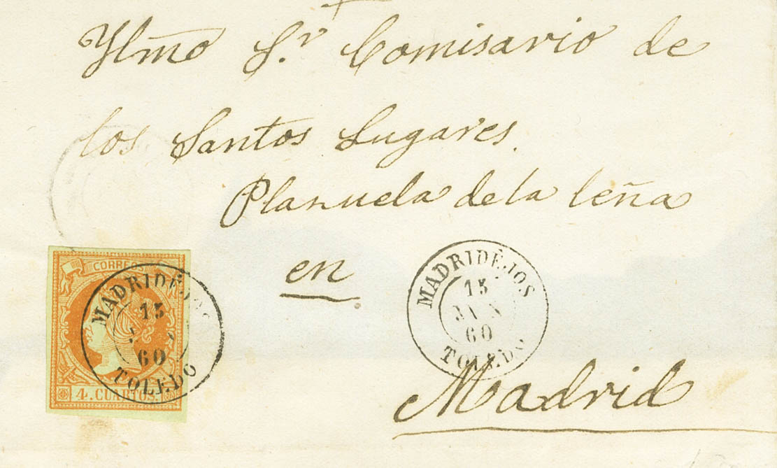 |ABOUT| 52. 1860. 4 orange quarters. MADRIDEJOS to MADRID. Postmark MADRIDEJOS / TOLEDO. MAGNIFICENT.