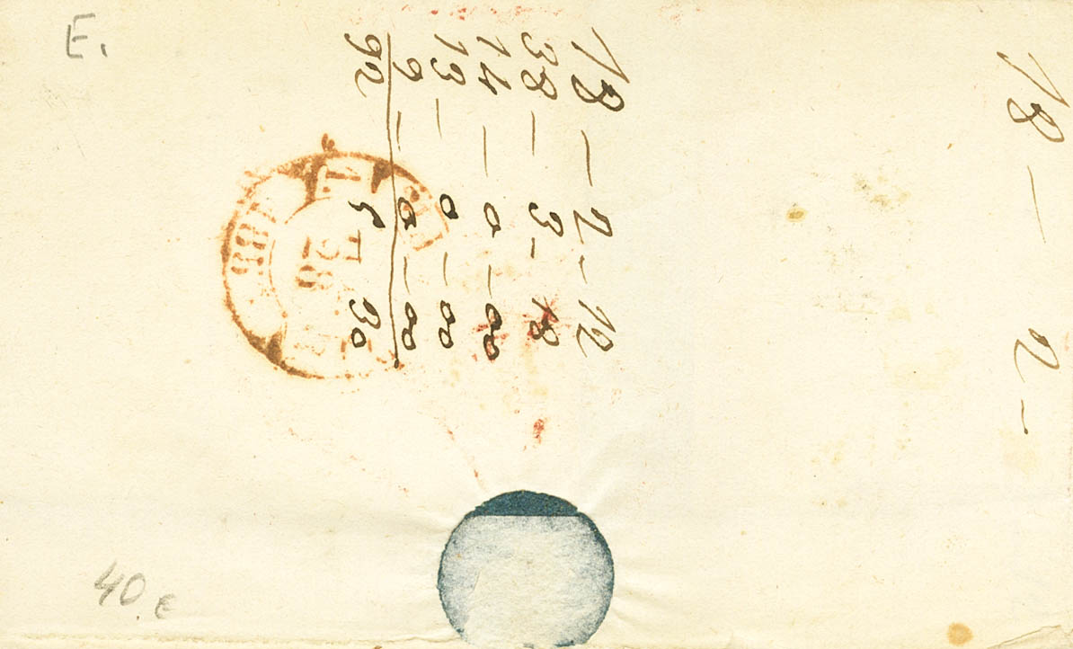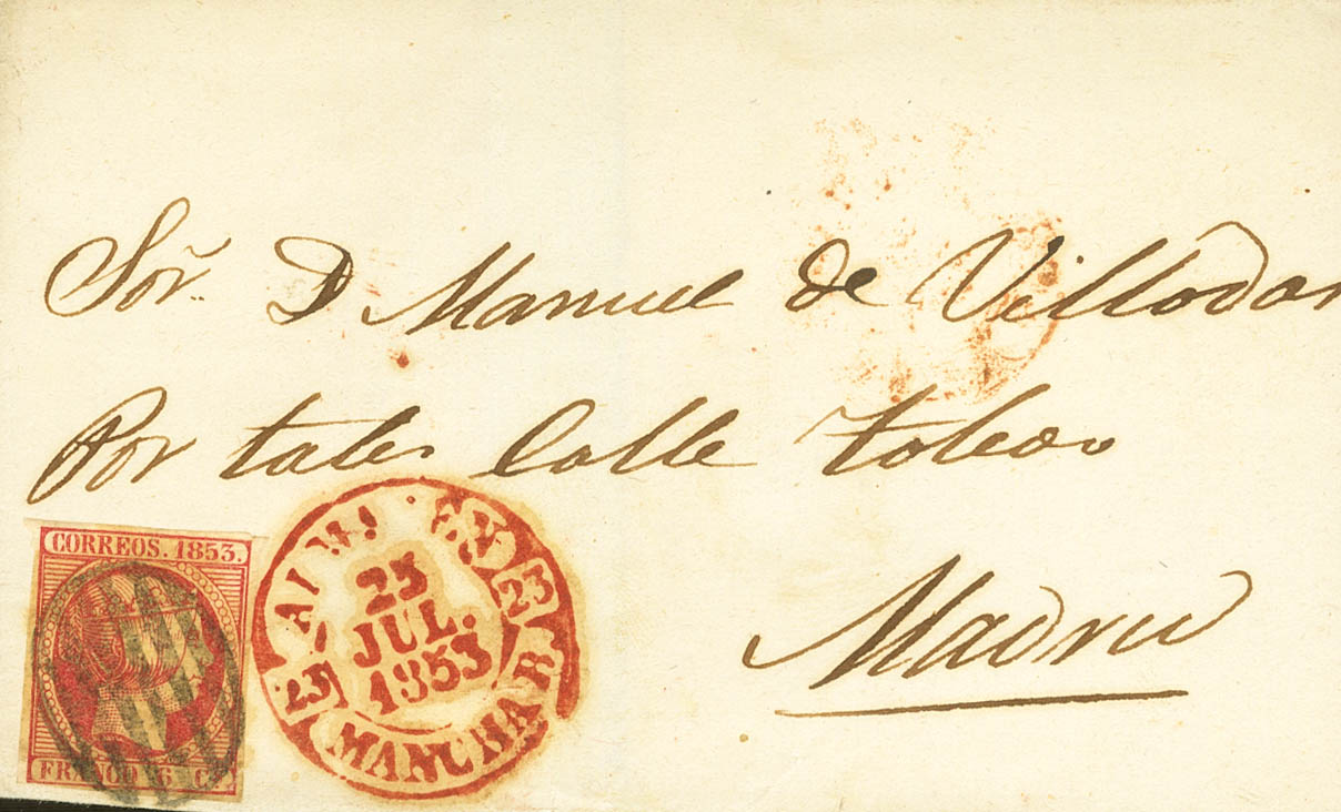 |ABOUT| 17. 1853. 6 carmine quarters. ALMADEN to MADRID. On the Baeza front ALMADEN / MANCHA B. MAGNIFICA.