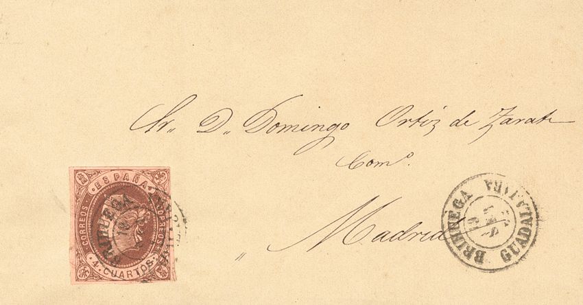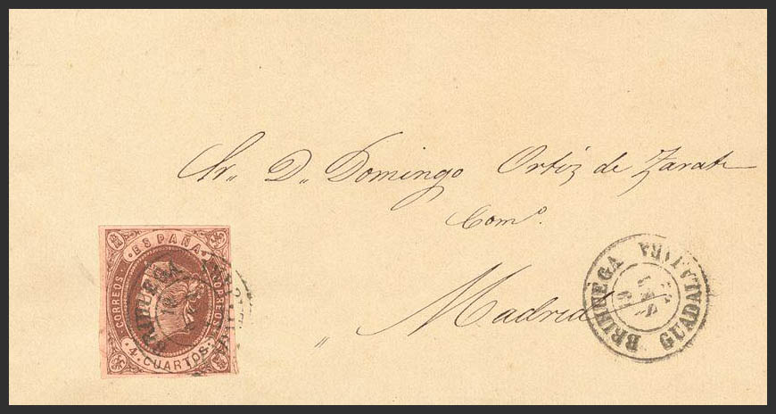 58. 1862. 4- cuartos chestnut. BRIHUEGA to MADRID. Postmark BRIHUEGA / GUADALAJARA. MAGNIFICENT AND RARE.