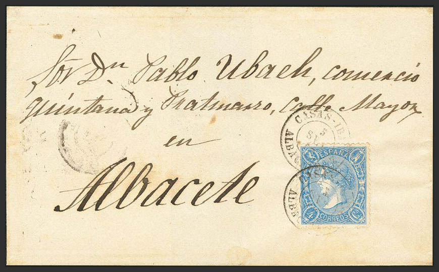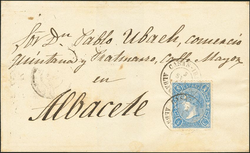 75. 1865. 4 cuartos blue. CASAS-IBAÑEZ to ALBACETE. Postmark CASAS-IBAÑEZ / ALBACETE. MAGNIFICENT.