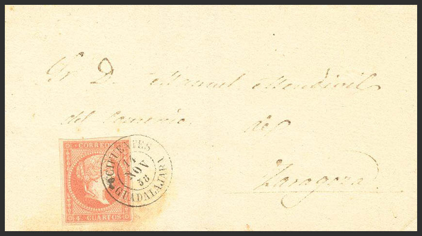 48. 1858. 4 red cuartos . CIFUENTES to ZARAGOZA. CIFUENTES / GUADALAJARA postmark. MAGNIFICENT AND RARE.