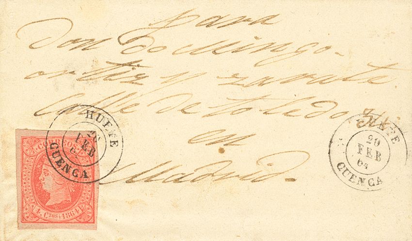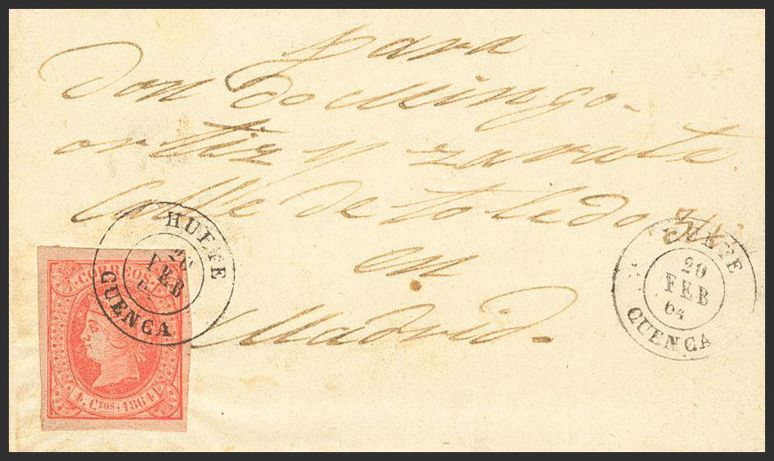 64. 1864. 4 pink cuartos . HUET to MADRID. Postmark HUETE / CUENCA. MAGNIFICENT AND RARE.