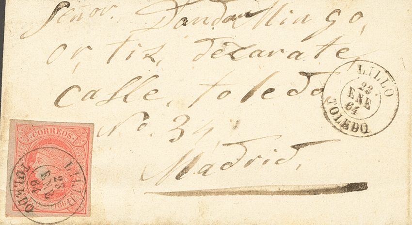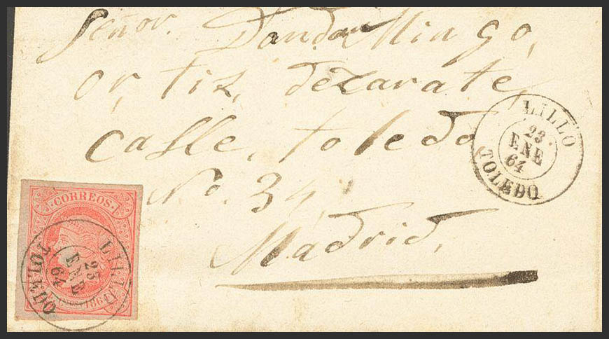64. 1864. 4 cuartos pink. LILLO to MADRID. Postmark LILLO / TOLEDO. MAGNIFICENT AND VERY RARE.