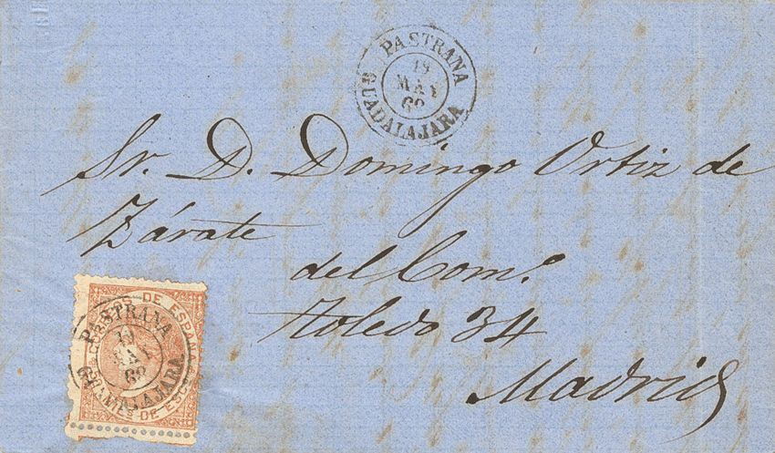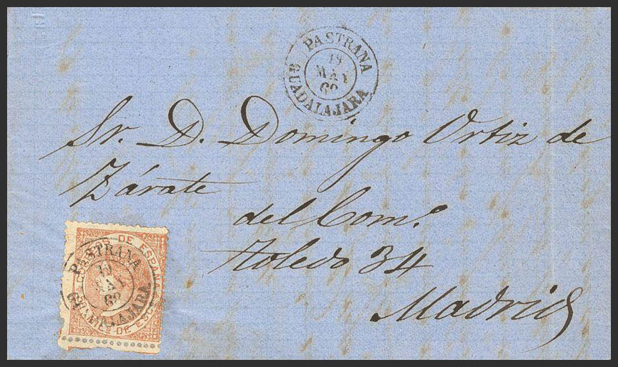 96. 1868. 50 mils chestnut. PASTRANA to MADRID. Postmark PASTRANA / GUADALAJARA. MAGNIFICENT AND RARE.