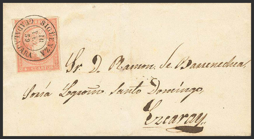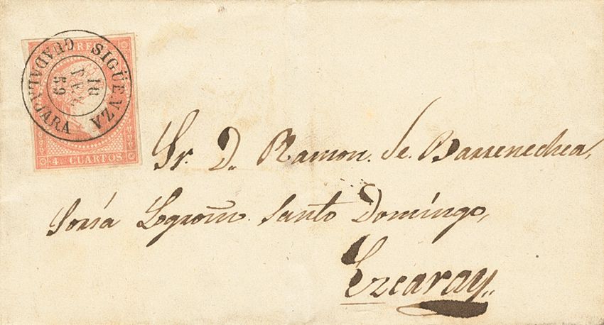 48. 1859. 4 red cuartos . FOLLOW EZCARAY. Postmark SIGÜENZA / GUADALAJARA. MAGNIFICENT.