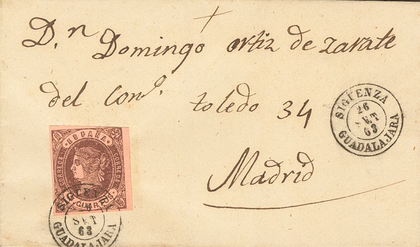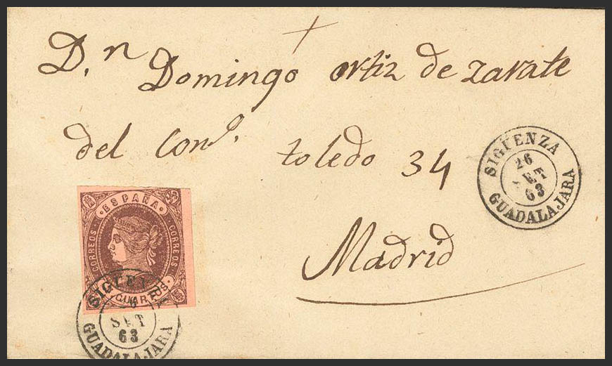 58. 1863. 4- cuartos chestnut. FOLLOW MADRID. Postmark SIGUENZA / GUADALAJARA. MAGNIFICENT.