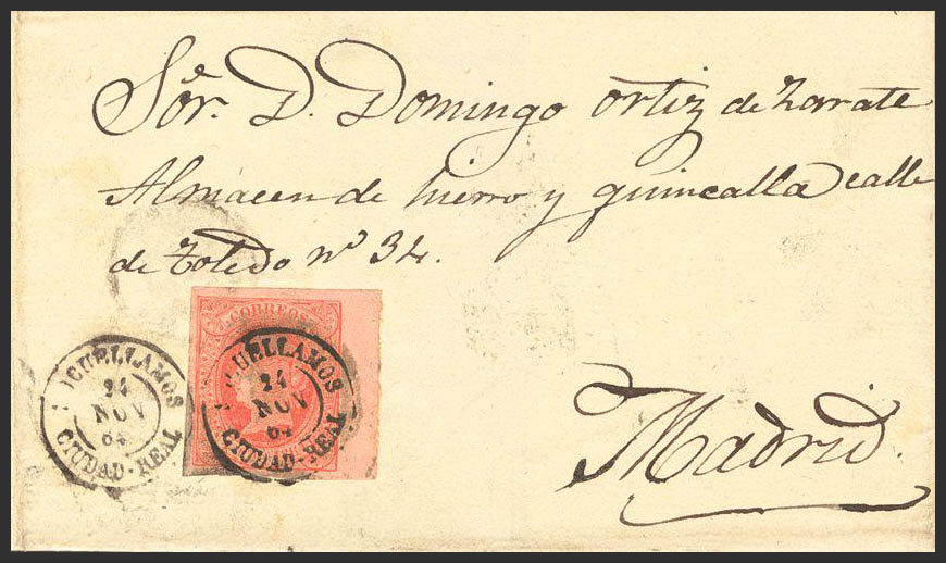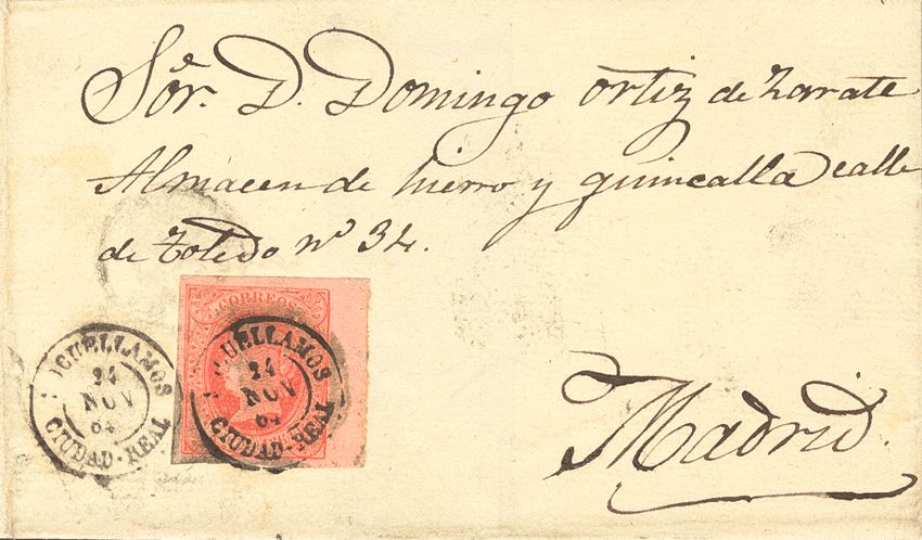 64. 1864. 4 pink cuartos . WE SOCUELLA MADRID. Postmark SOCUELLAMOS / CIUDAD-REAL. MAGNIFICENT.