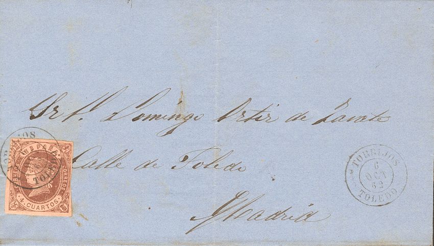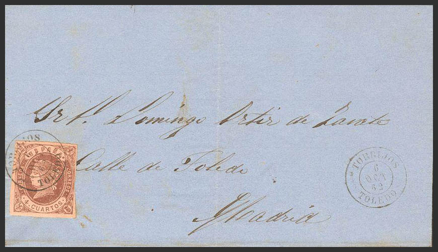 58. 1862. 4- cuartos chestnut. TORRIJOS to MADRID. Postmark TORRIJOS / TOLEDO. MAGNIFICENT.