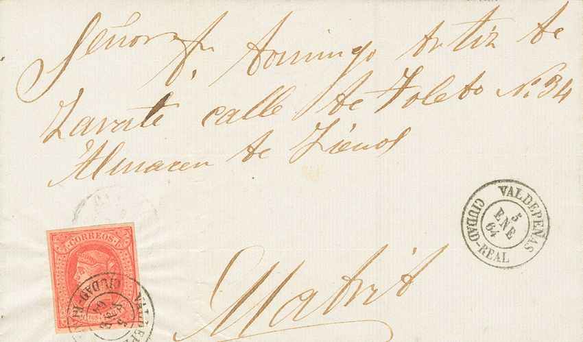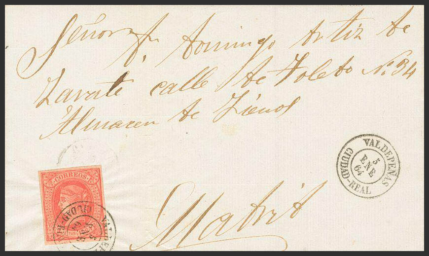 64. 1864. 4 cuartos pink. VALDEPEÑAS to MADRID. Postmark VALDEPEÑAS / CIUDAD-REAL. MAGNIFICENT AND RARE.