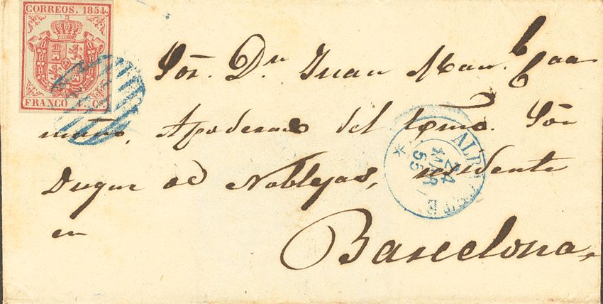 33. 1855. 4 carmine cuartos . ALBACETE to BARCELONA. Postmark GRILL, in blue. MAGNIFICENT.