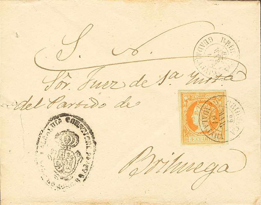 52. 1861. 4 cuartos yellow. Addressed to BRIHUEGA. Postmark BRIHUEGA / GUADALAJARA. MAGNIFICENT.