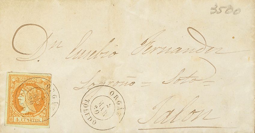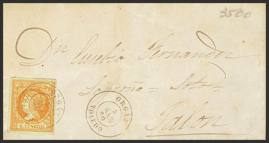 52. 1860. 4 quarters orange. ORGAZ to JALON. Postmark ORGAZ / TOLEDO. MAGNIFICENT.