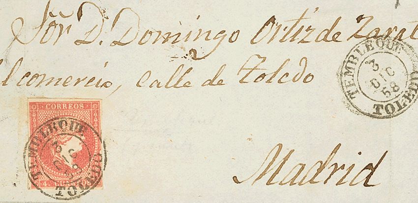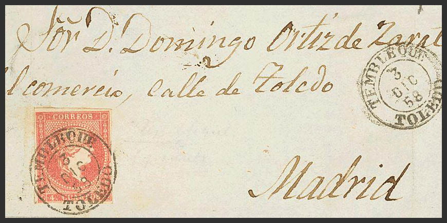 48. 1858. 4 red cuartos . Front of TEMBLEQUE to MADRID. Postmark TEMBLEQUE / TOLEDO (Type I). MAGNIFICENT AND VERY RARE.