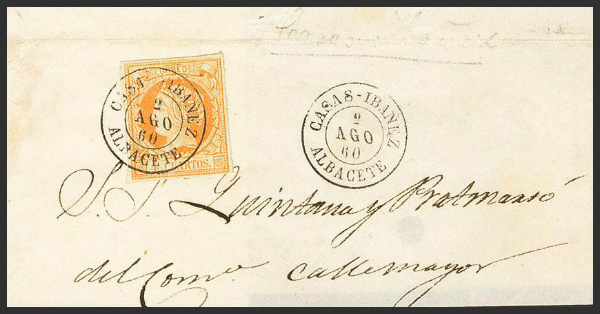 △ 52. 1860. 4 orange cuartos , on large fragment. Postmark CASAS-IBAÑEZ / ALBACETE. MAGNIFICENT.