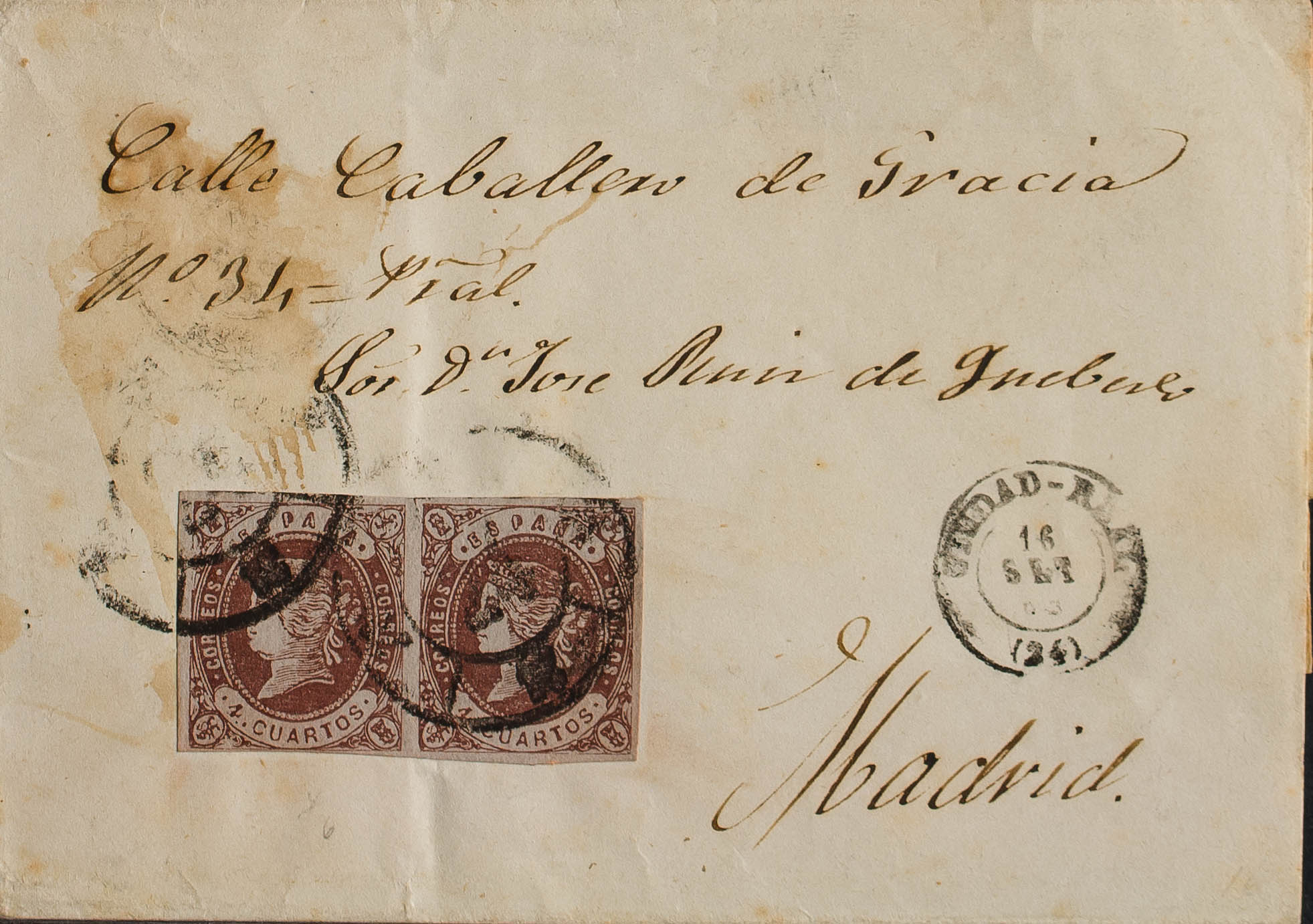 58(2). 1862. 4 cuartos chestnut, pair. CIUDAD-REAL to MADRID. Postmark R. CARRETA Nº24. BEAUTIFUL AND UNUSUAL DOUBLE PORT.