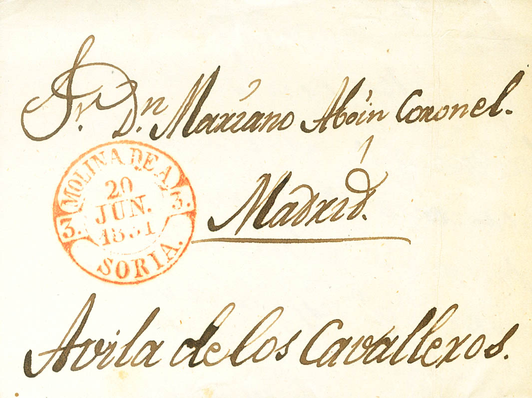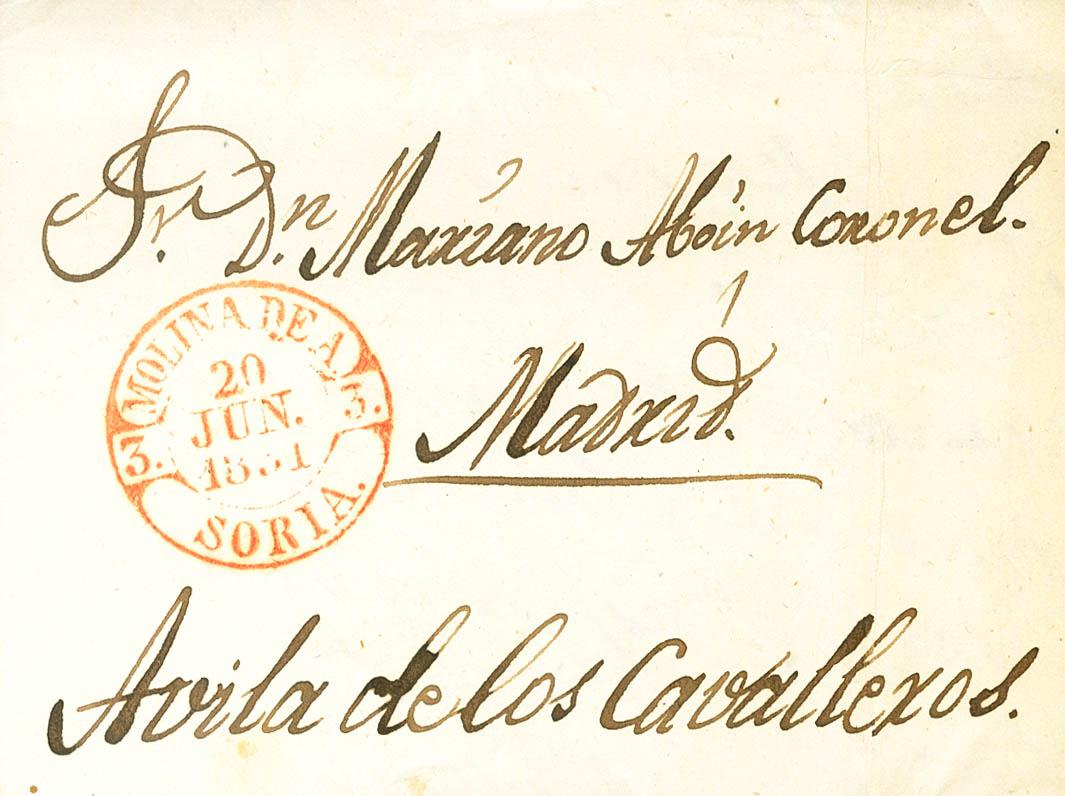 |ABOUT|1851. MOLINA DE ARAGON (GUADALAJARA) to AVILA. Baeza MOLINA DE A. / SORIA, in red. MAGNIFICENT PRINT.