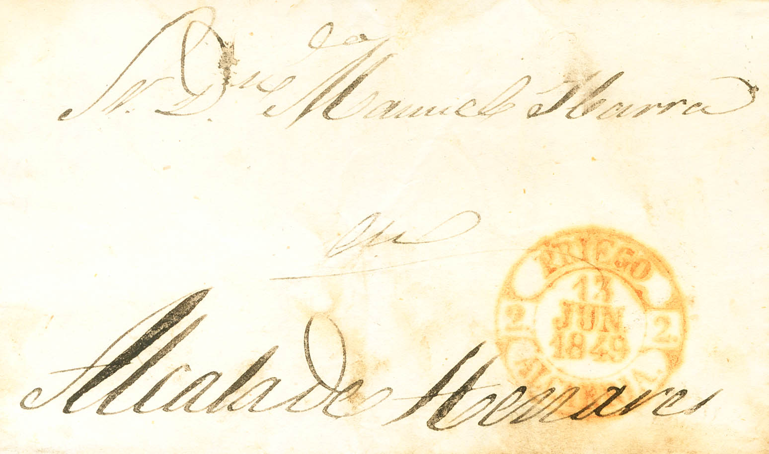 |ABOUT|1849. PRIEGO (CUENCA) to ALCALA DE HENARES. Baeza PRIEGO / ALCARRIA, in red. MAGNIFICENT AND VERY RARE.