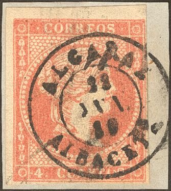 English △ 48. 1856. 4 red cuartos , on fragment. Postmark ALCARAZ / ALBACETE. LUXURY.