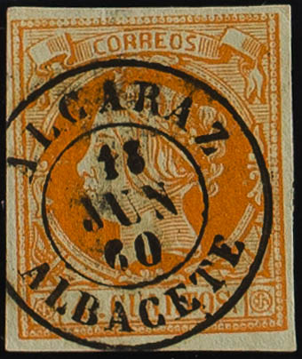 52. 1860. 4 cuartos yellow. Postmark ALCARAZ / ALBACETE. MAGNIFICENT.