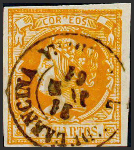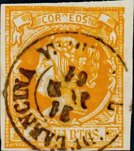 52. 1860. 4 orange cuartos . Postmark HIENDELAENCINA / GUADALAJARA. MAGNIFICENT AND RARE.