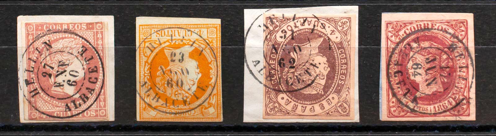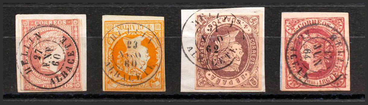 48, 52, 58, 64. (1855ca). Set of four 4- cuartos stamps red, yellow, brown and pink, unused with the HELLIN / ALBACETE postmark. MAGNIFICENT.